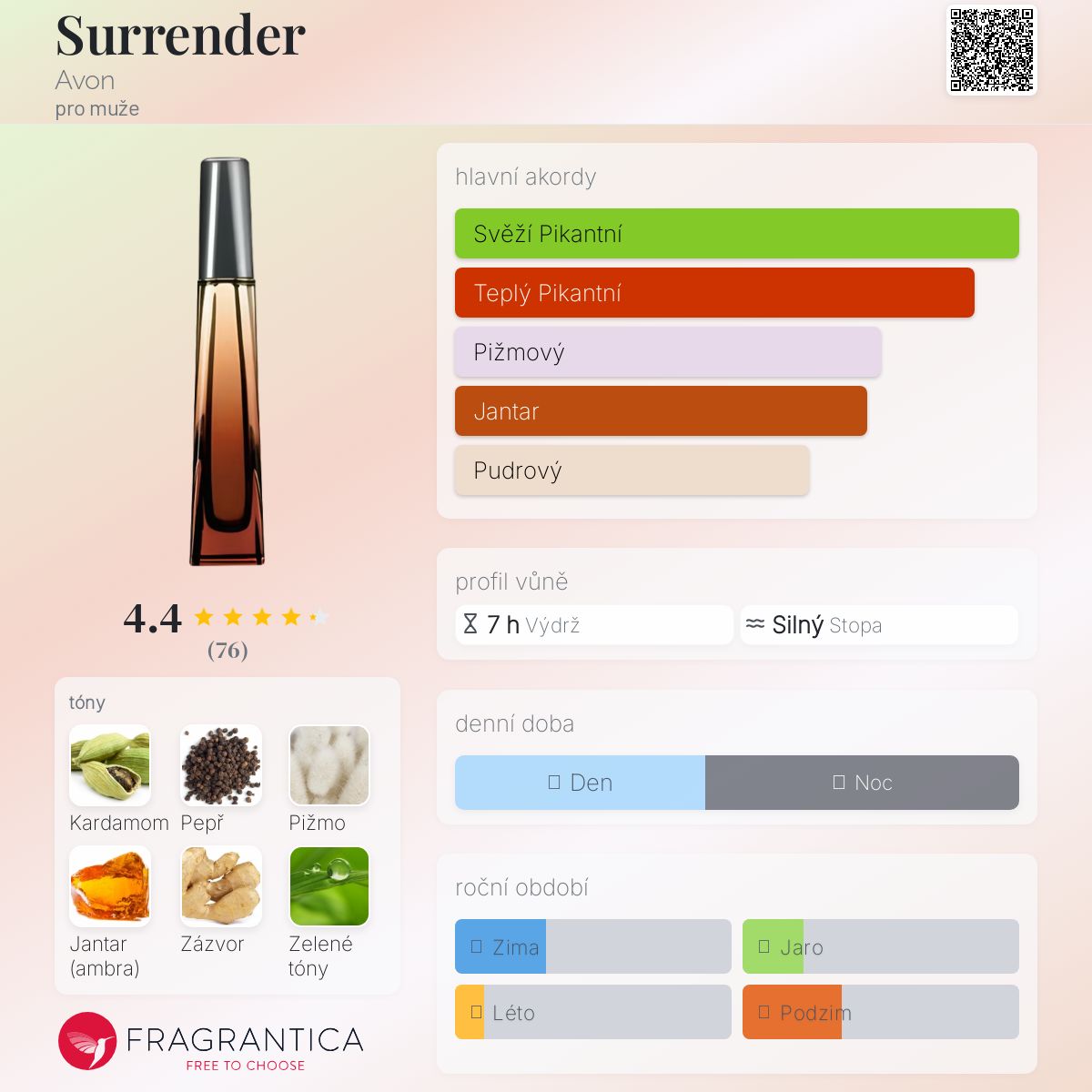 Surrender podle Avon je Aromatic Spicy vůně pro muže. Surrender byl/a uveden/a v roce 2004. Vrchní tóny jsou Kardamom, Pepř a Zázvor; střední tón jeZelené tóny ; základní tóny jsou Pižmo a Jantar (ambra).