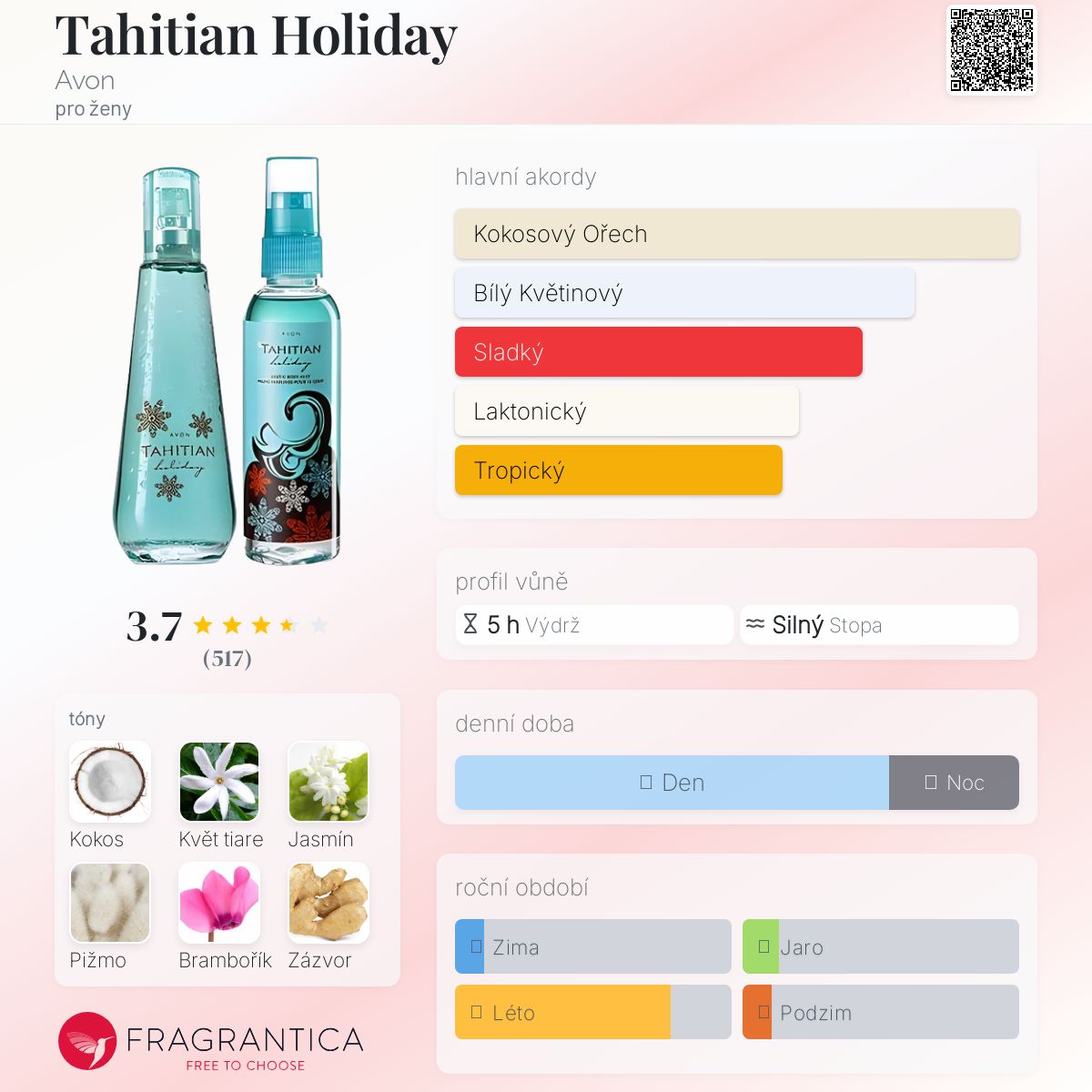 Tahitian Holiday podle Avon je Floral vůně pro ženy. Tahitian Holiday byl/a uveden/a v roce 2008. Vrchní tóny jsou Brambořík a Zázvor; střední tóny jsouKokos, Květ tiare a Jasmín ; základní tón je Pižmo.