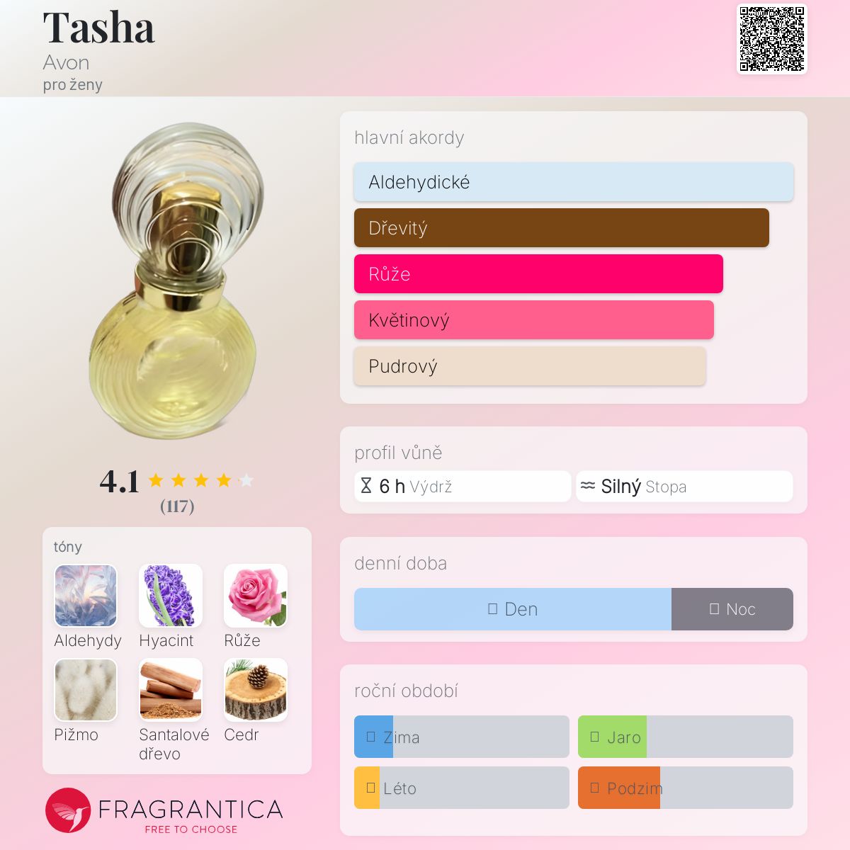 Tasha podle Avon je Floral Aldehyde vůně pro ženy. Tasha byl/a uveden/a v roce 1979. Vrchní tóny jsou Aldehydy a Hyacint; střední tóny jsouRůže a Jasmín ; základní tóny jsou Pižmo, Santalové dřevo, Cedr a Jantar (ambra).