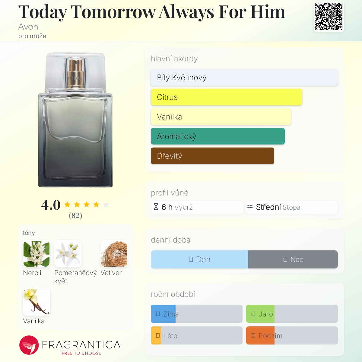 Today Tomorrow Always For Him podle Avon je vůně pro muže. Today Tomorrow Always For Him byl/a uveden/a v roce 2021. Vrchní tón je Neroli ; střední tóny jsouPomerančový květ a Vanilka ; základní tón je Haitský vetiver.