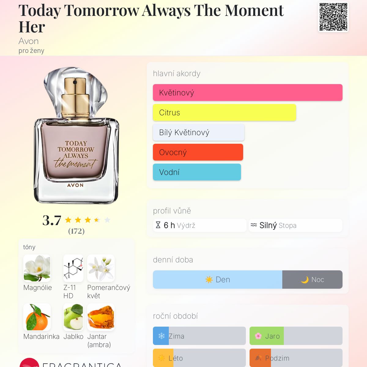 Today Tomorrow Always The Moment Her podle Avon je Orientální Floral vůně pro ženy. Today Tomorrow Always The Moment Her byl/a uveden/a v roce 2022. Vrchní tóny jsou Magnólie, Italská mandarinka a Jablko; střední tóny jsouPomerančový květ, Pomeranč a Neroli ; základní tóny jsou Z-11 HD, Jantar (ambra) a Fazole tonka a Fazole tonka.