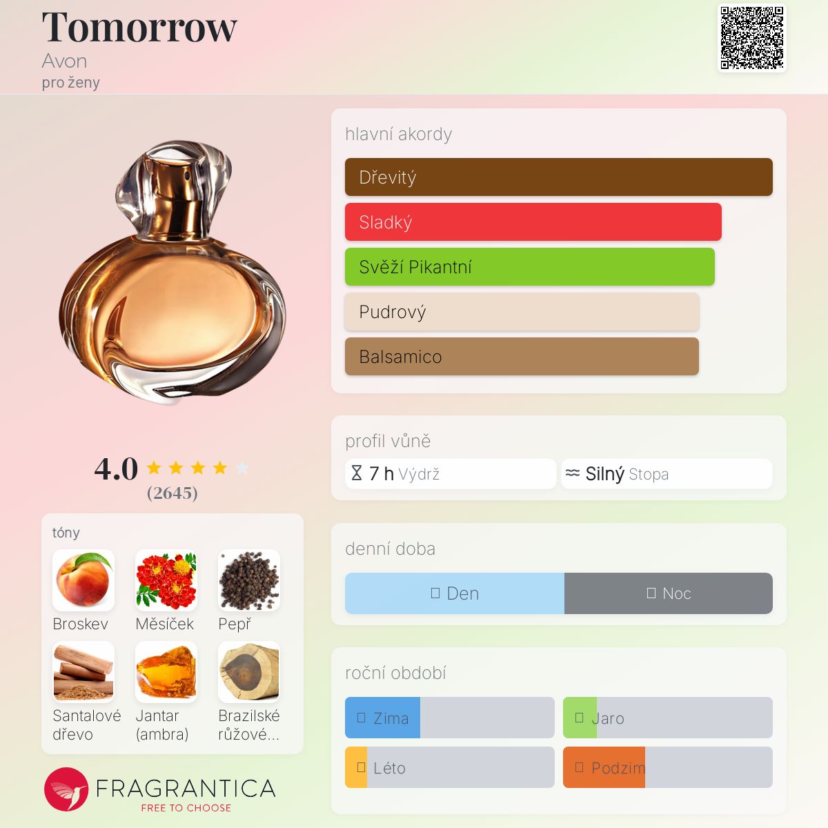 Tomorrow podle Avon je Orientální Floral vůně pro ženy. Tomorrow byl/a uveden/a v roce 2005. "Nosem" za touto vůní je Olivier Cresp. Vrchní tóny jsou Broskev, Aksamitník, Pepř, Pačuli a Maliny; střední tóny jsouPomerančový květ a Fialka ; základní tóny jsou Santalové dřevo, Jantar (ambra), Brazilské růžové dřevo a Bílé pižmo. Tento parfém je vítězem oceněníFiFi Award Fragrance Of The Year Women`s Private Label 2005 .