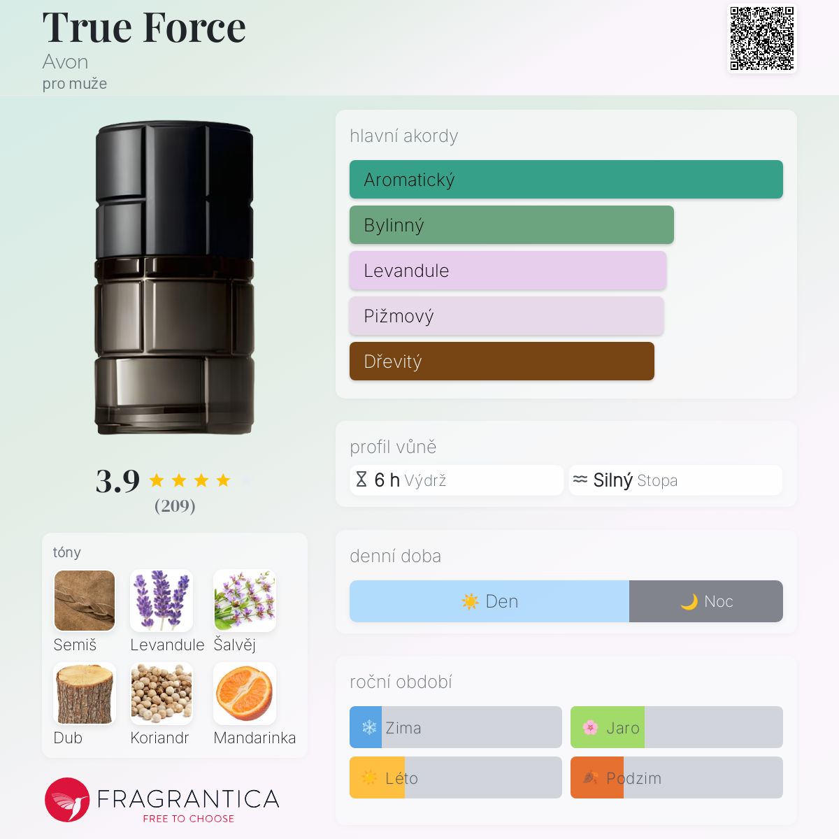 True Force podle Avon je Chypre vůně pro muže. True Force byl/a uveden/a v roce 2010. Vrchní tóny jsou Levandule a Mandarinka; střední tóny jsouŠalvěj, Koriandr a Muškátový oříšek ; základní tóny jsou Semiš, Dub, Pačuli, Pižmo a Jantar (ambra).