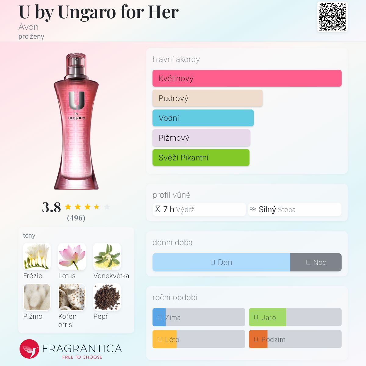 U by Ungaro for Her podle Avon je Floral vůně pro ženy. U by Ungaro for Her byl/a uveden/a v roce 2008. U by Ungaro for Her byl/a vytvořen/a Jean-Marc Chaillan a Loc Dong. Vrchní tóny jsou Frézie, Pepř a Bergamot; střední tóny jsouLotus, Vonokvětka a Mimóza ; základní tóny jsou Pižmo, Kořen orris a Santalové dřevo.