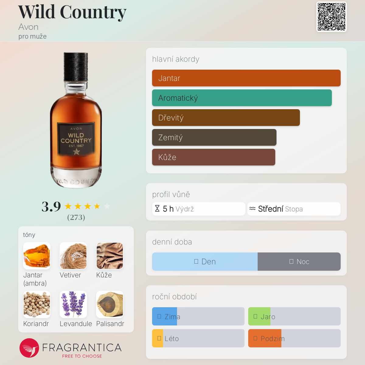 Wild Country podle Avon je Aromatic vůně pro muže. Wild Country byl/a uveden/a v roce 2004. "Nosem" za touto vůní je Christelle Laprade. Vrchní tóny jsou Koriandr, Citrón a Rebarbora; střední tóny jsouLevandule, Palisandr a Černý pepř ; základní tóny jsou Jantar (ambra), Vetiver a Kůže.