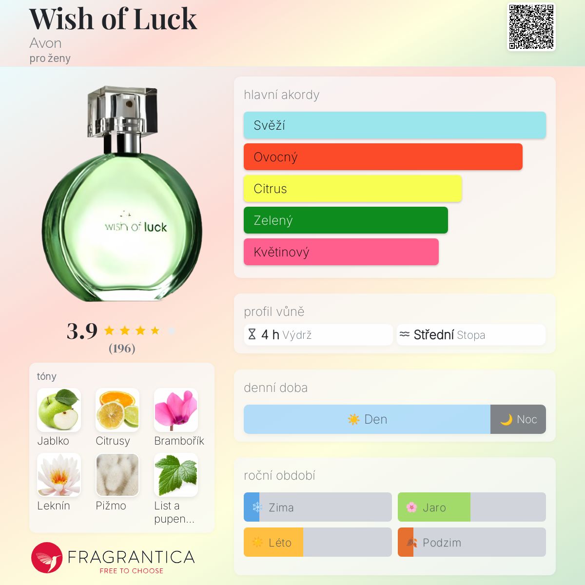 Wish of Luck podle Avon je Floral Green vůně pro ženy. Vrchní tóny jsou Zelené jablko a Citrusy; střední tóny jsouBrambořík, Leknín a Kasie ; základní tóny jsou Pižmo, Vanilka a Dřevité tóny.