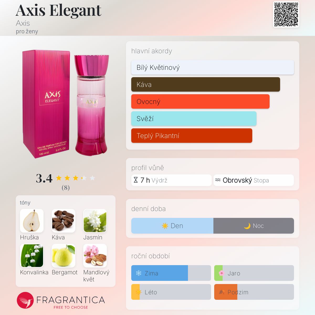 Axis Elegant podle Axis je Orientální Floral vůně pro ženy. Axis Elegant byl/a uveden/a v roce 2017. Vrchní tóny jsou Hruška, Káva a Bergamot; střední tóny jsouJasmín, Konvalinka a Mandlový květ ; základní tóny jsou Cedr a Santalové dřevo.