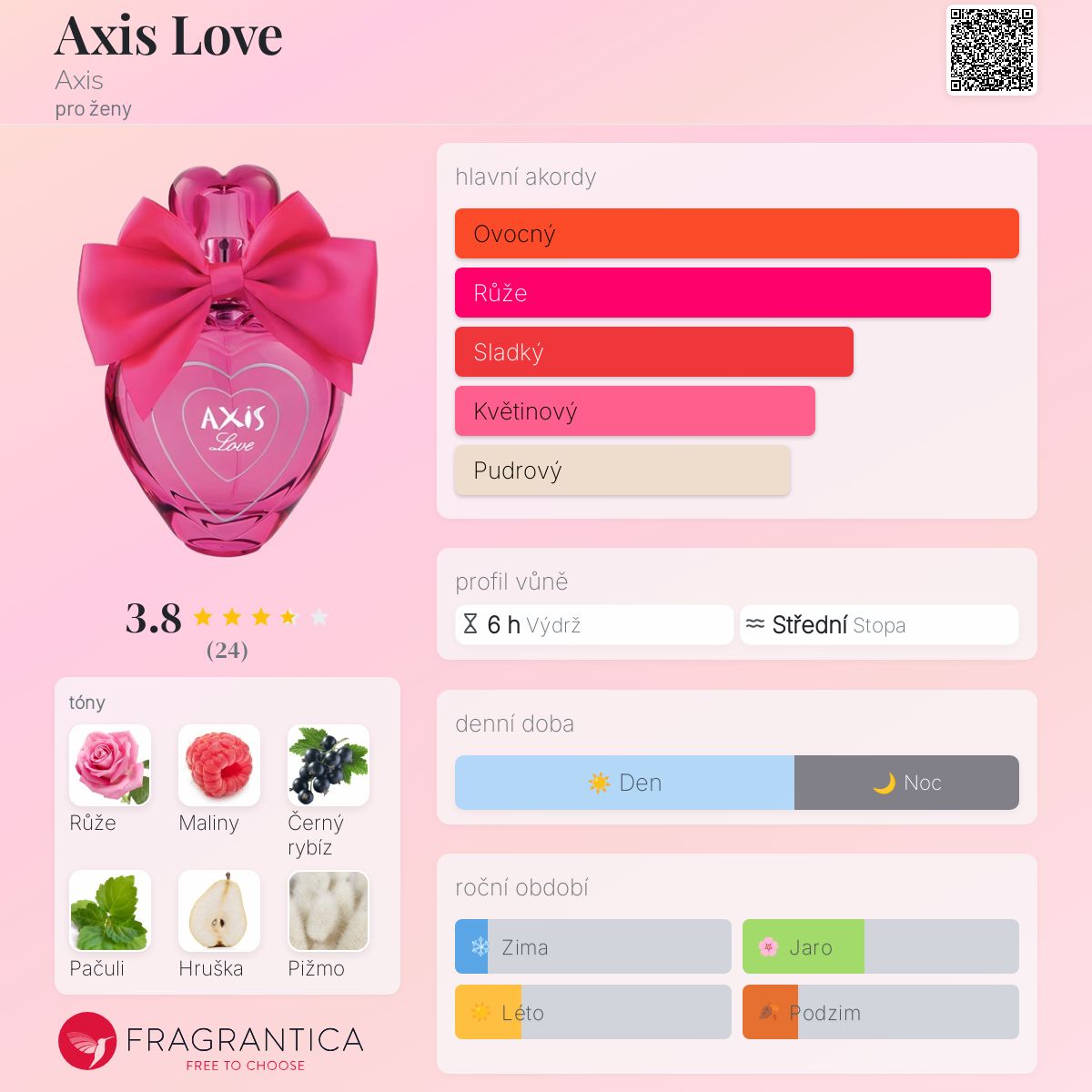 Axis Love podle Axis je Floral Fruity vůně pro ženy. Axis Love byl/a uveden/a v roce 2012. Vrchní tóny jsou Černý rybíz, Hruška a Citrón; střední tóny jsouRůže, Maliny a Fialka ; základní tóny jsou Pačuli, Pižmo a Vanilka.