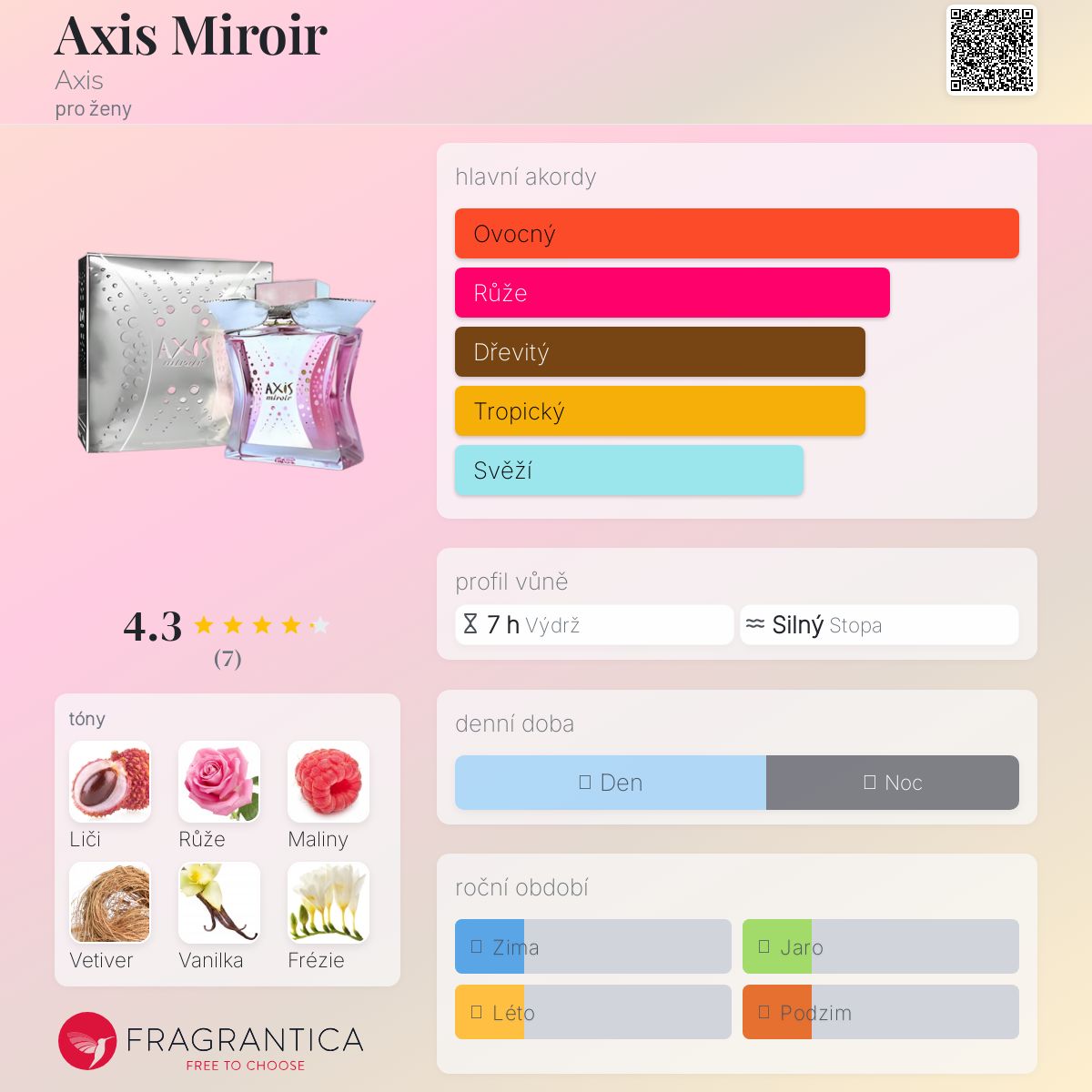 Axis Miroir podle Axis je Orientální Floral vůně pro ženy. Axis Miroir byl/a uveden/a v roce 2009. Vrchní tóny jsou Liči a Maliny; střední tóny jsouRůže a Frézie ; základní tóny jsou Vetiver, Vanilka, Pačuli, Virginský cedr a Jantar (ambra).