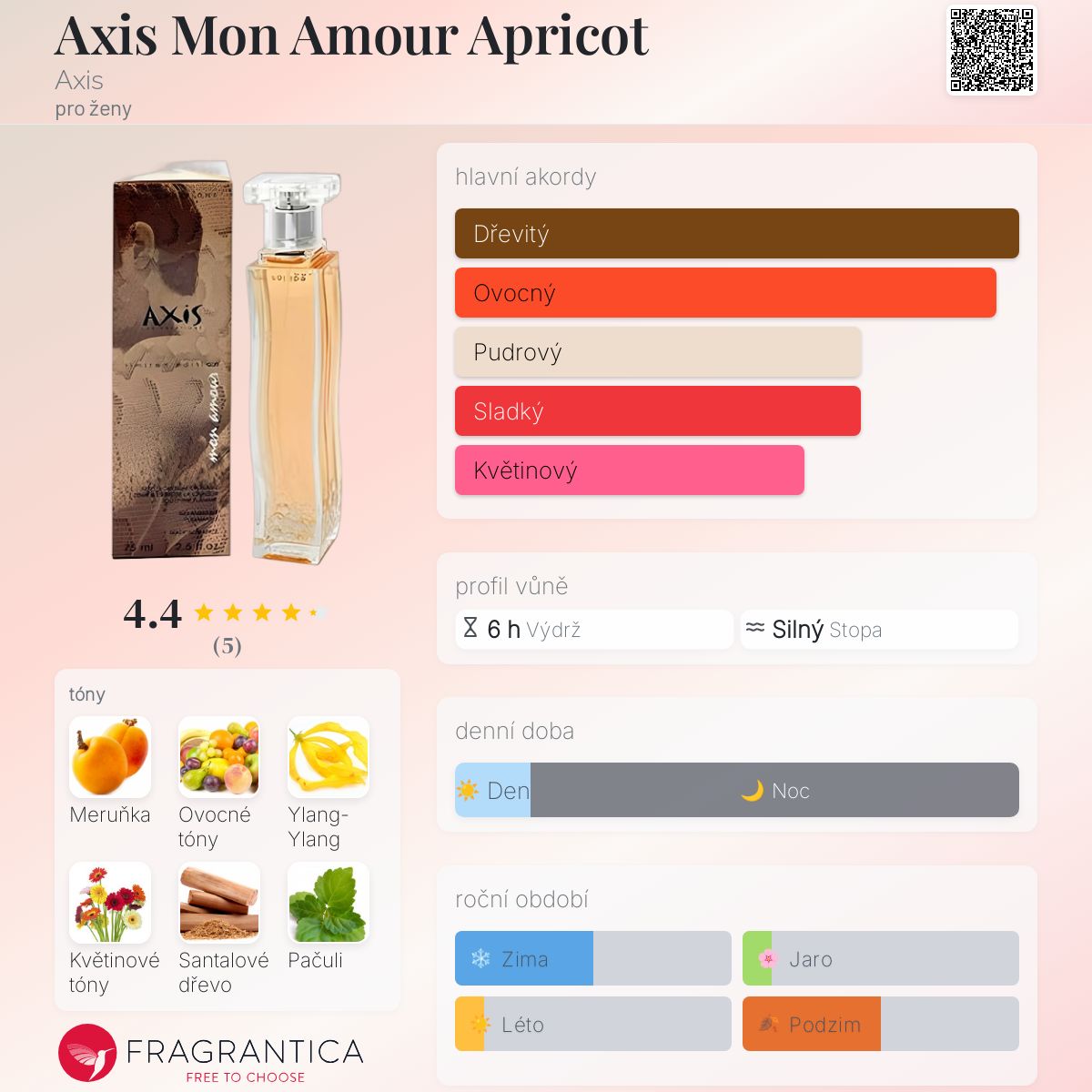 Axis Mon Amour Apricot podle Axis je Floral Fruity vůně pro ženy. Axis Mon Amour Apricot byl/a uveden/a v roce 2005. Vrchní tóny jsou Meruňka a Ovocné tóny; střední tóny jsouYlang-Ylang a Květinové tóny ; základní tóny jsou Santalové dřevo, Pačuli a Virginský cedr.