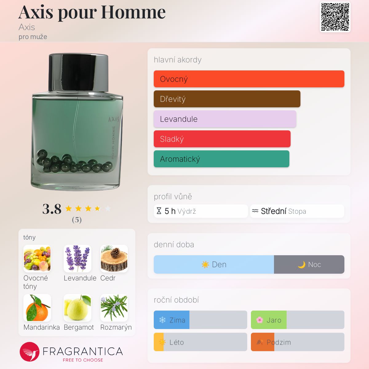 Axis pour Homme podle Axis je Woody Aromatic vůně pro muže. Axis pour Homme byl/a uveden/a v roce 2002. Vrchní tóny jsou Ovocné tóny, Mandarinka a Bergamot; střední tóny jsouLevandule, Rozmarýn a Kořeněné tóny ; základní tóny jsou Cedr a Pačuli.