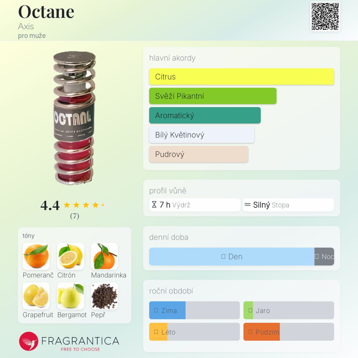 Octane podle Axis je Citrus Aromatic vůně pro muže. Octane byl/a uveden/a v roce 2001. Vrchní tóny jsou Pomeranč, Citrón, Mandarinka, Grapefruit, Bergamot a Černý pepř; střední tóny jsouKoriandr, Bazalka, Jasmín, Růže, Fialka a Konvalinka ; základní tóny jsou Pižmo, Dřevité tóny a Vanilka.