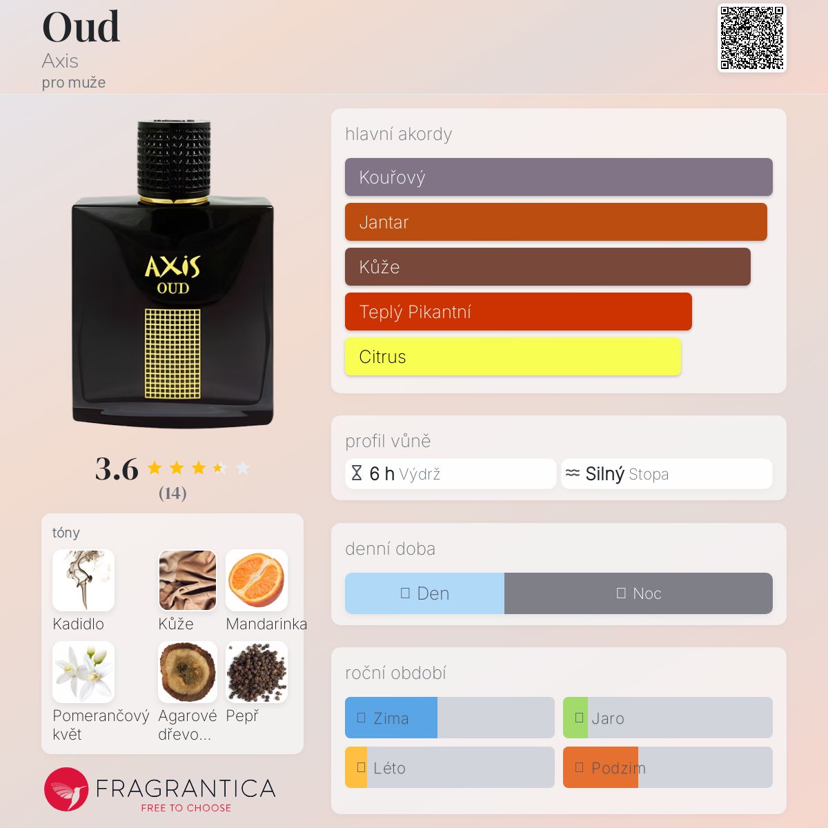 Oud podle Axis je vůně pro muže. Oud byl/a uveden/a v roce 2015. Vrchní tóny jsou Mandarinka, Černý pepř a Šafrán; střední tóny jsouPomerančový květ, Pačuli a Rozmarýn ; základní tóny jsou Kadidlo, Kůže, Agarové dřevo (oud) a Jantar (ambra).