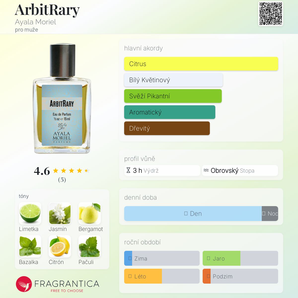 ArbitRary podle Ayala Moriel je Chypre Fruity vůně pro muže. "Nosem" za touto vůní je Ayala Moriel. Vrchní tóny jsou Limetka, Bergamot a Bazalka; střední tóny jsouJasmín a Citron amalfi ; základní tóny jsou Pačuli a Dubový mech.