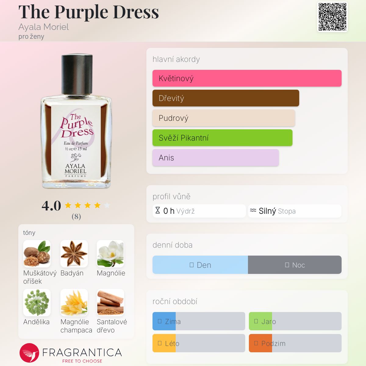 The Purple Dress podle Ayala Moriel je Orientální Floral vůně pro ženy. The Purple Dress byl/a uveden/a v roce 2009. "Nosem" za touto vůní je Ayala Moriel. Vrchní tóny jsou Muškátový oříšek a Badyán; střední tóny jsouMagnólie a Magnólie champaca ; základní tóny jsou Andělika, Santalové dřevo, Guajakové dřevo a Čaj.