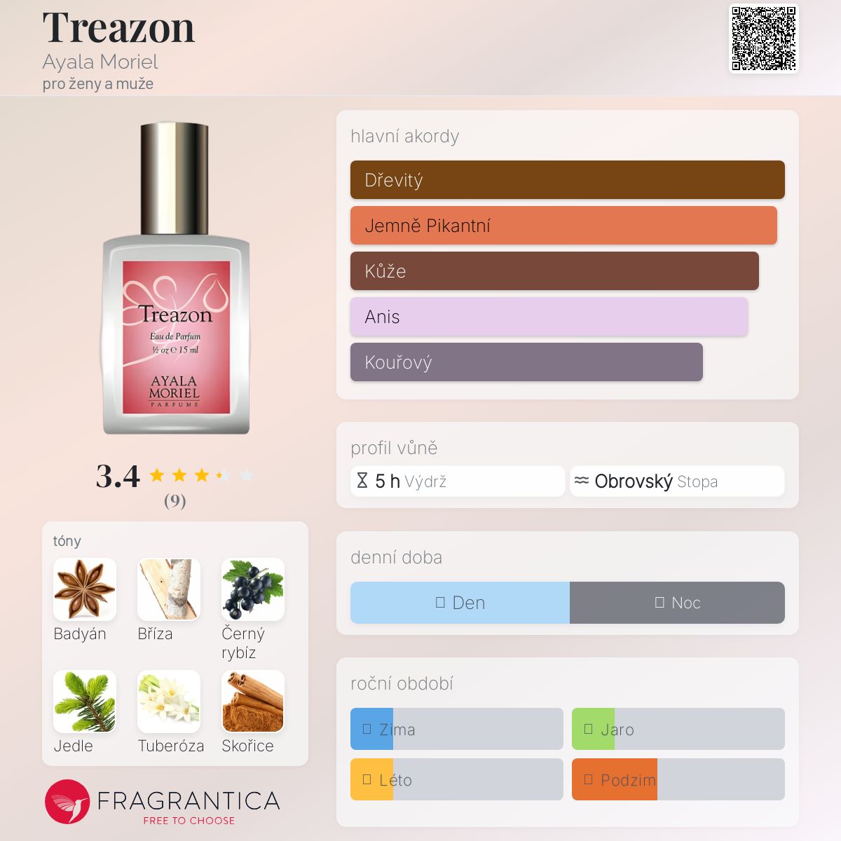 Treazon podle Ayala Moriel je Floral vůně pro ženy a muže. Treazon byl/a uveden/a v roce 2012. "Nosem" za touto vůní je Ayala Moriel. Vrchní tóny jsou Badyán, Bříza, Černý rybíz, Jedle a Skořice; střední tóny jsouTuberóza, Pomerančový květ a Kosatec ; základní tóny jsou Benzoin, Massioa a Daman.