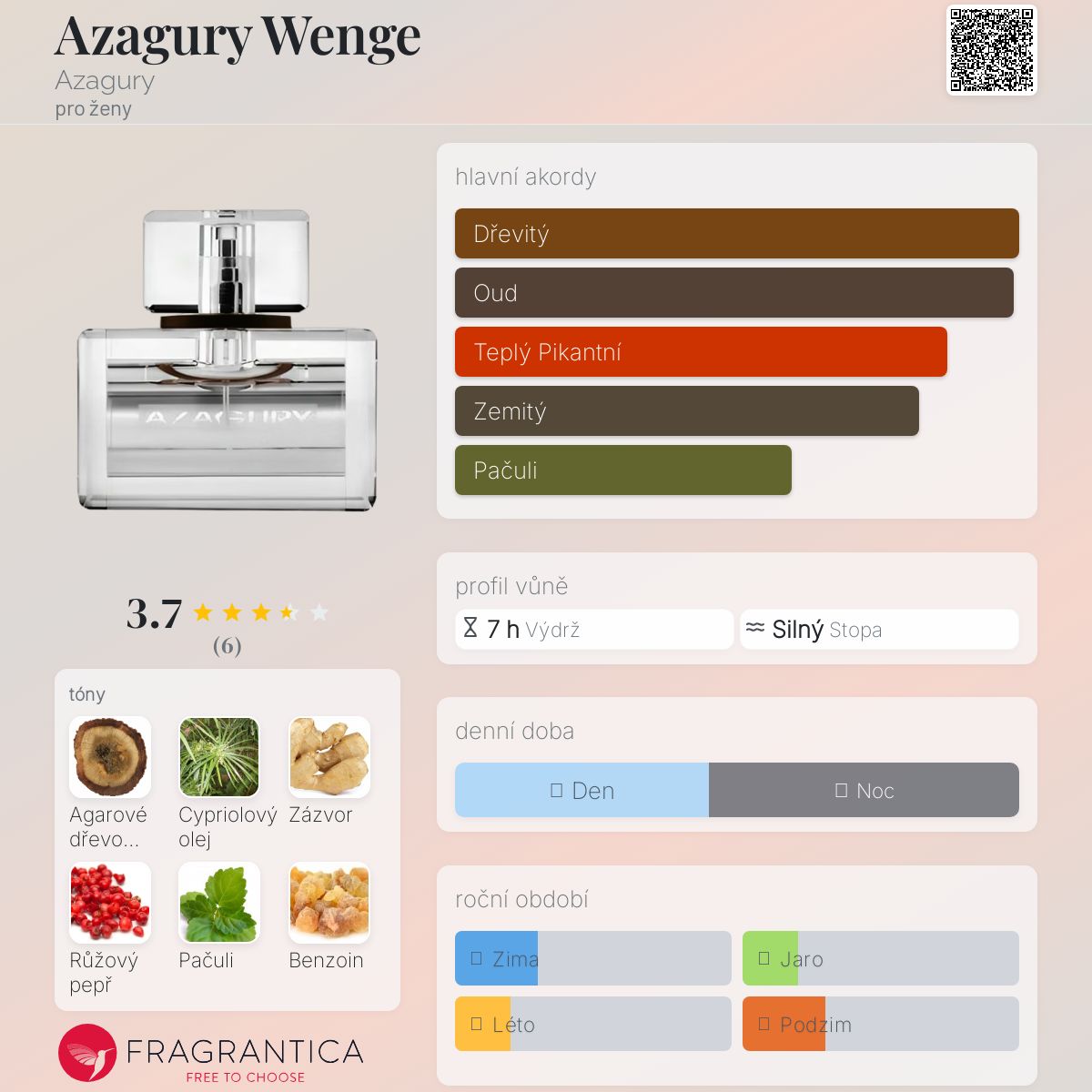 Azagury Wenge podle Azagury je Woody Spicy vůně pro ženy. Azagury Wenge byl/a uveden/a v roce 2013. Vrchní tóny jsou Zázvor, Růžový pepř, Šafrán, Tuberóza a Pelargónie; střední tóny jsouAgarové dřevo (oud), Cypriolový olej, Pačuli a Růže ; základní tóny jsou Benzoin, Pačuli, Vanilka, Santalové dřevo a Vetiver.