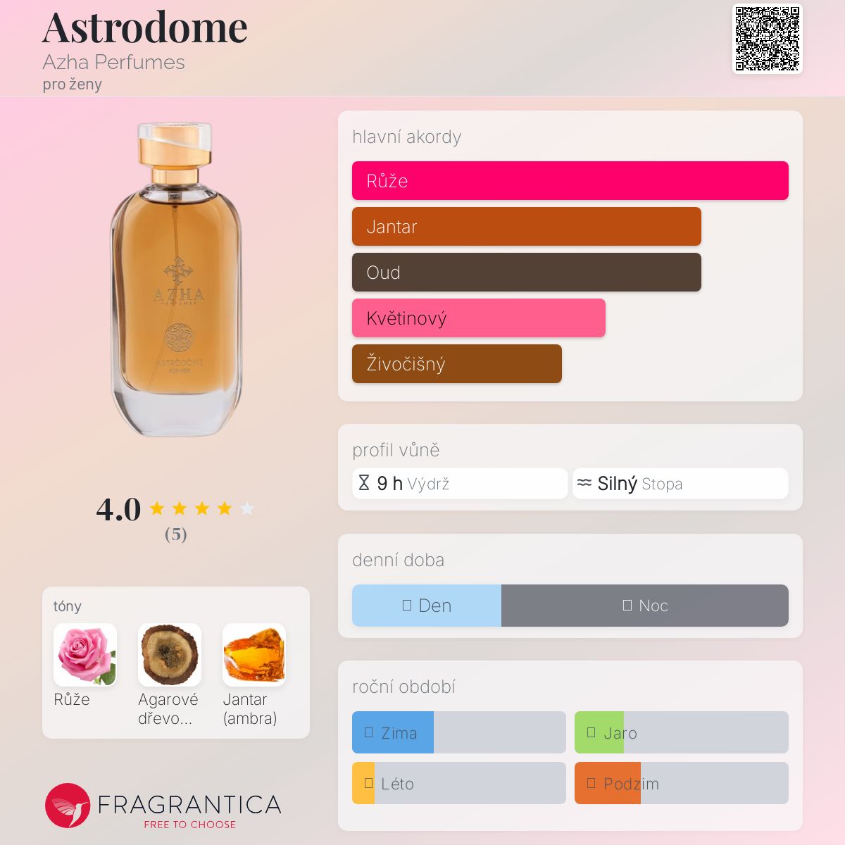 Astrodome podle Azha Perfumes je Orientální Floral vůně pro ženy. Vrchní tón je Agarové dřevo (oud) ; střední tón jeRůže ; základní tón je Jantar (ambra).