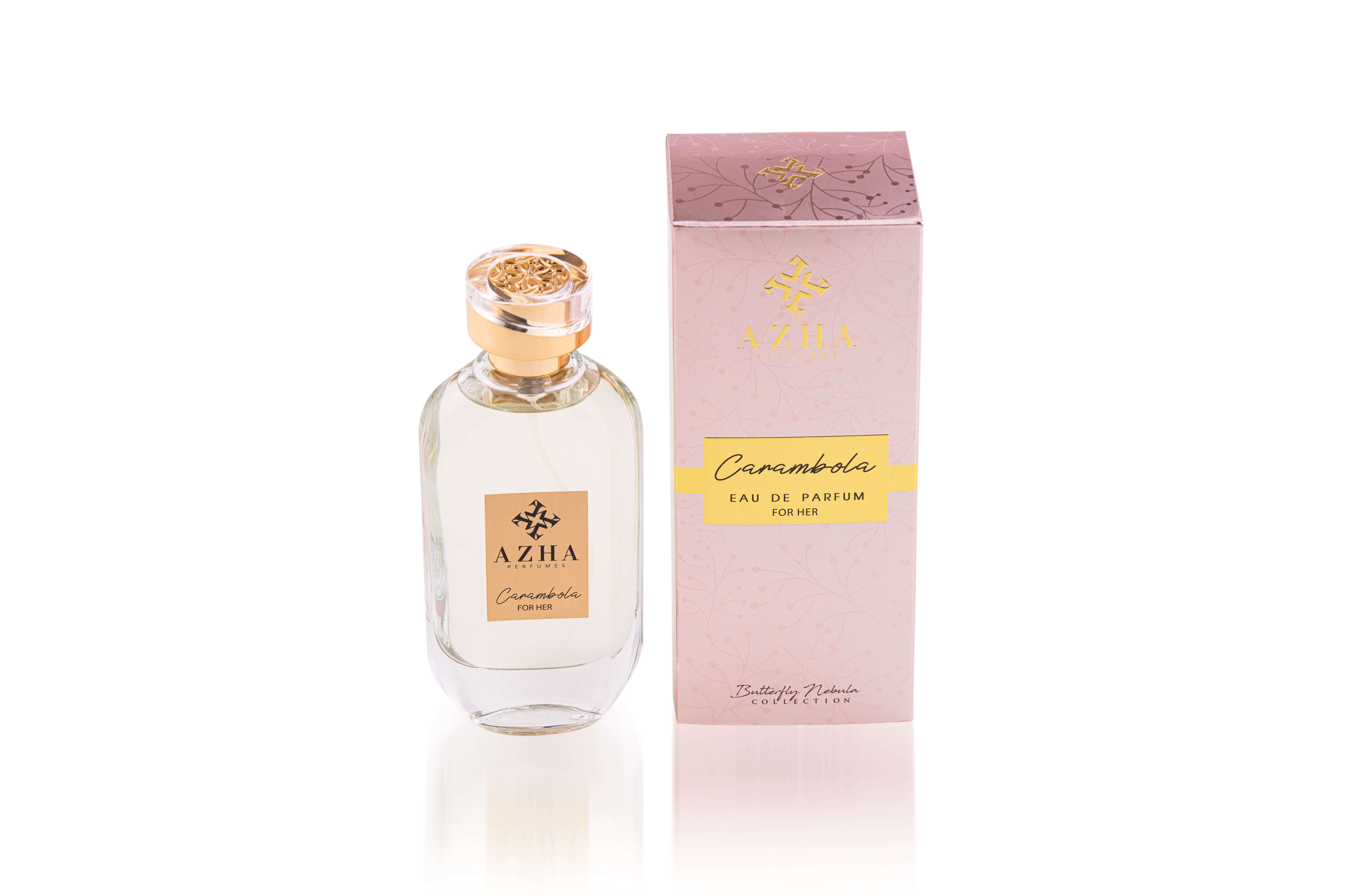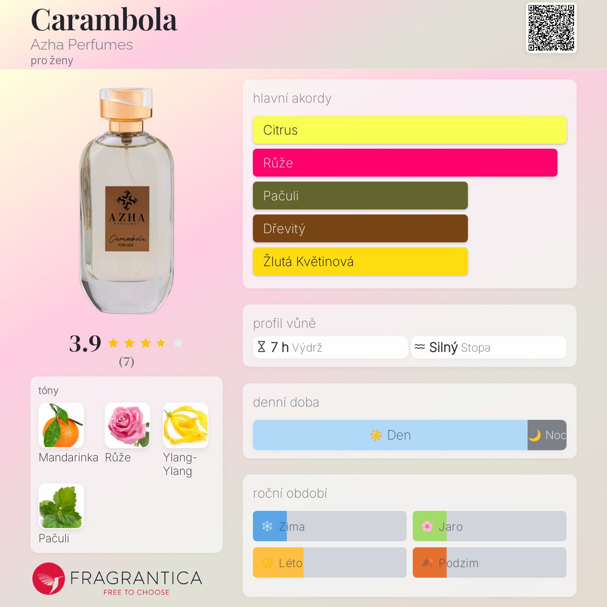 Carambola podle Azha Perfumes je Chypre Floral vůně pro ženy. Vrchní tón je Ylang-Ylang ; střední tóny jsouMandarinka a Růže ; základní tón je Pačuli.
