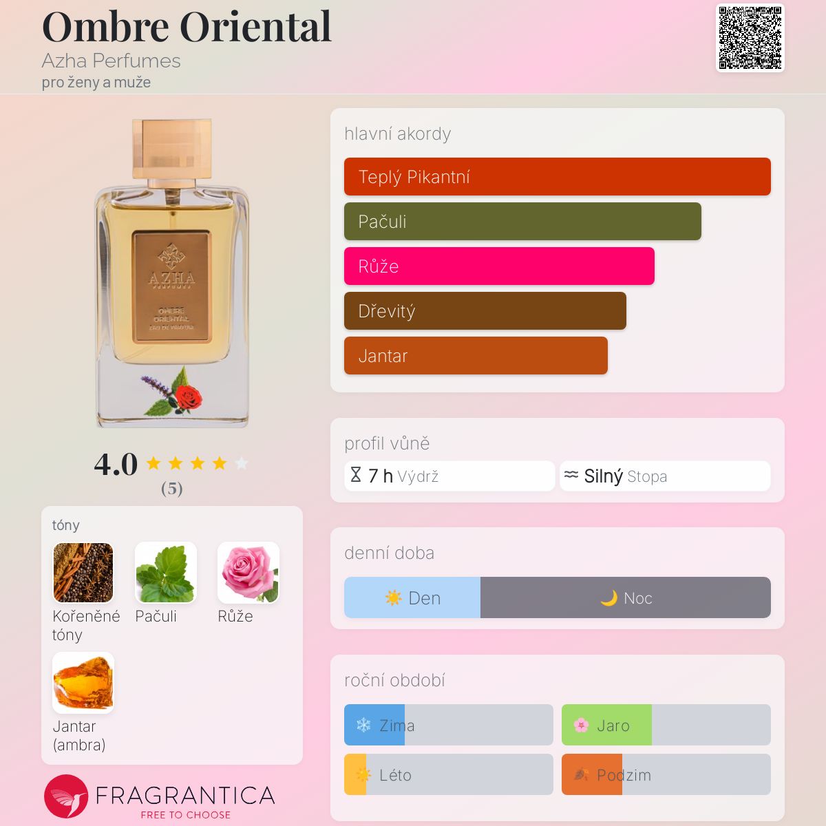 Ombre Oriental podle Azha Perfumes je Orientální Floral vůně pro ženy a muže. Vrchní tón je Koření ; střední tón jeRůže ; základní tóny jsou Pačuli a Jantar (ambra).
