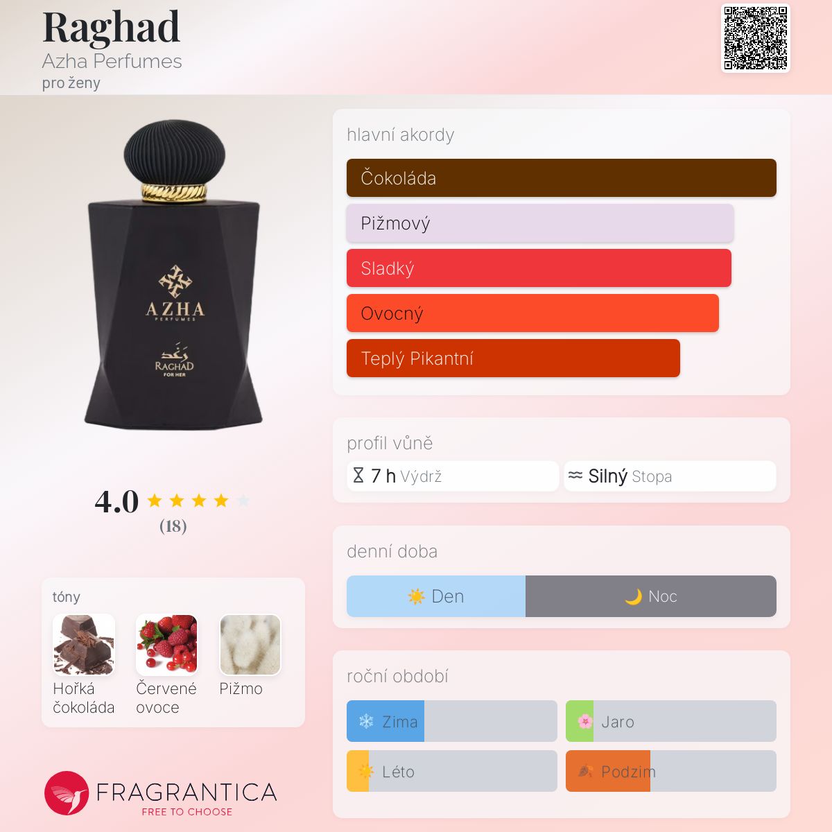Raghad podle Azha Perfumes je Floral Fruity Gourmand vůně pro ženy. Vrchní tón je Červené ovoce ; střední tón jeČokoláda ; základní tón je Pižmo.