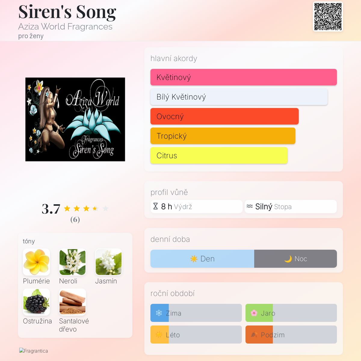 Siren's Song podle Aziza World Fragrances je Floral Green vůně pro ženy. Siren's Song byl/a uveden/a v roce 2013. "Nosem" za touto vůní je Aziza Poggi.