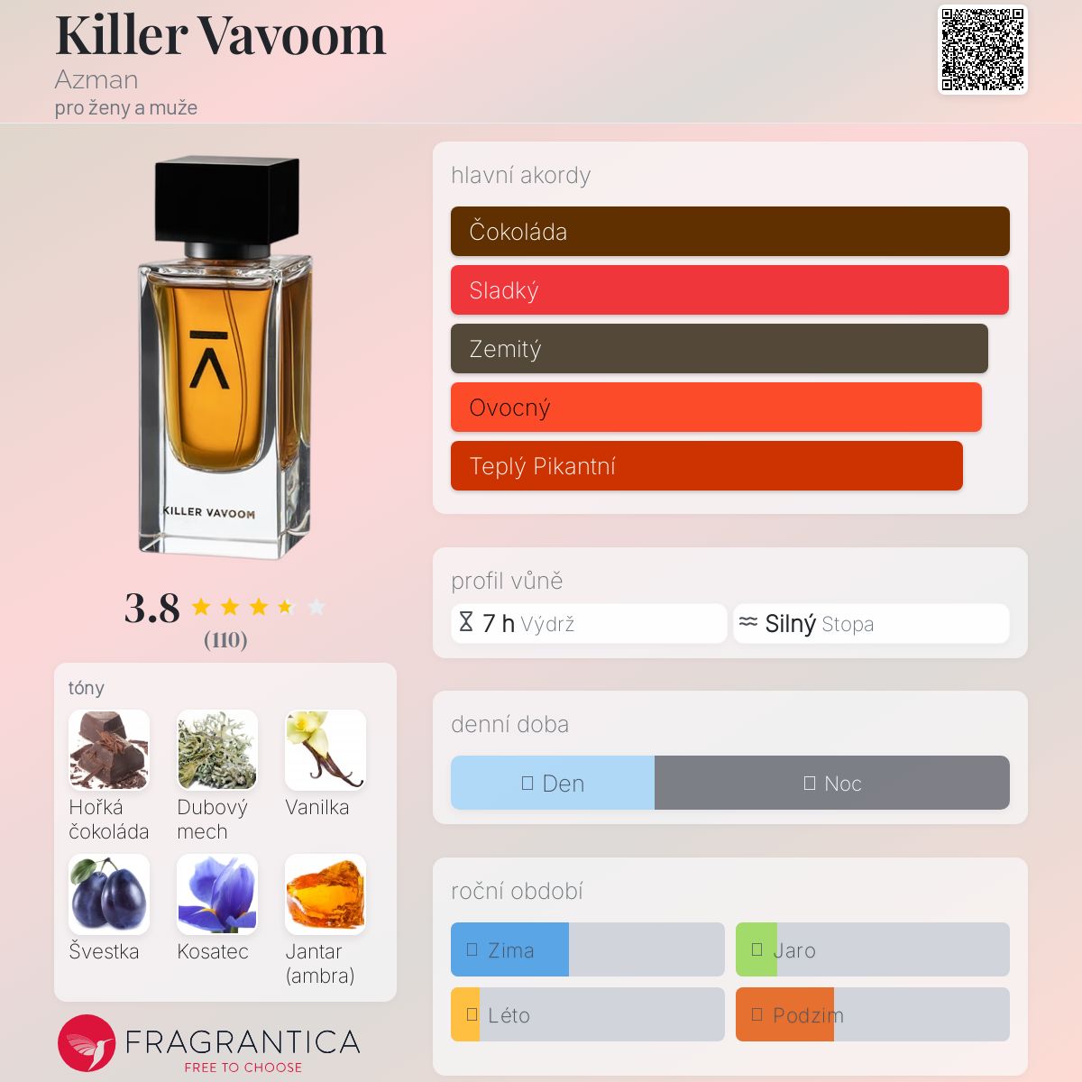 Killer Vavoom podle Azman je Orientální Floral vůně pro ženy a muže. Killer Vavoom byl/a uveden/a v roce 2022. "Nosem" za touto vůní je Miguel Matos. Vrchní tóny jsou Čokoláda, Švestka a Bergamot; střední tóny jsouKosatec, Ambrette (přírodní pižmo), Vonokvětka, Jasmín a Růže ; základní tóny jsou Dubový mech, Vanilka, Jantar (ambra), Kůže, Pačuli a Pižmo.