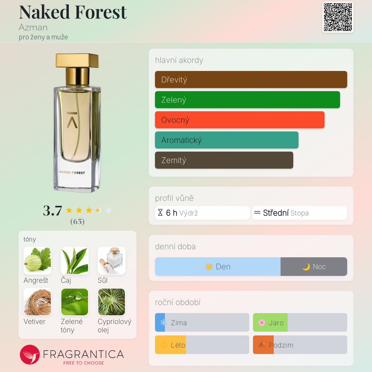 Naked Forest podle Azman je Woody Aromatic vůně pro ženy a muže. Toto je nová vůně. Naked Forest byl/a uveden/a v roce 2024. "Nosem" za touto vůní je Prin Lomros. Vrchní tóny jsou Sůl, Zelený tón, Horský vzduch, Kapka rosy, Ozonové tóny a Minerální tóny; střední tóny jsouAngrešt, Čaj, Cypriolový olej, Lesní plody, Beton, Mango, Magnólie, Orris a Kadidlo ; základní tóny jsou Sůl, Vetiver, Galbanum, Santalové dřevo, Mořské tóny, Ambra a Agarové dřevo (oud).