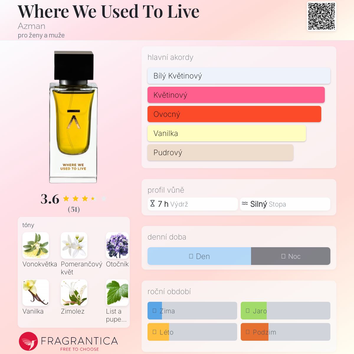 Where We Used To Live podle Azman je vůně pro ženy a muže. Where We Used To Live byl/a uveden/a v roce 2022. "Nosem" za touto vůní je Euan McCall. Vrchní tóny jsou Zimolez, Černý rybíz a Magnólie; střední tóny jsouVonokvětka, Pomerančový květ, Otočník, Růže, Jasmín a Šafrán ; základní tóny jsou Vanilka, Pižmo, Cypriolový olej, Vetiver, Agarové dřevo (oud) a Pačuli.