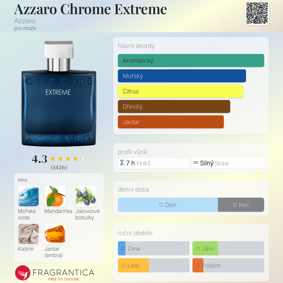 Azzaro Chrome Extreme podle Azzaro je Citrus Aromatic vůně pro muže. Azzaro Chrome Extreme byl/a uveden/a v roce 2020. Vrchní tón je Zelená mandarinka ; střední tóny jsouMořské tóny a Jalovcové bobulky ; základní tóny jsou Kašmír a Jantar (ambra).