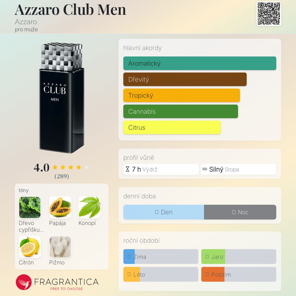 Azzaro Club Men podle Azzaro je Woody Aromatic vůně pro muže. Azzaro Club Men byl/a uveden/a v roce 2013. Vrchní tóny jsou Papája a Citrón; střední tón jeKonopí ; základní tóny jsou Cypřišek tupolistý a Pižmo.