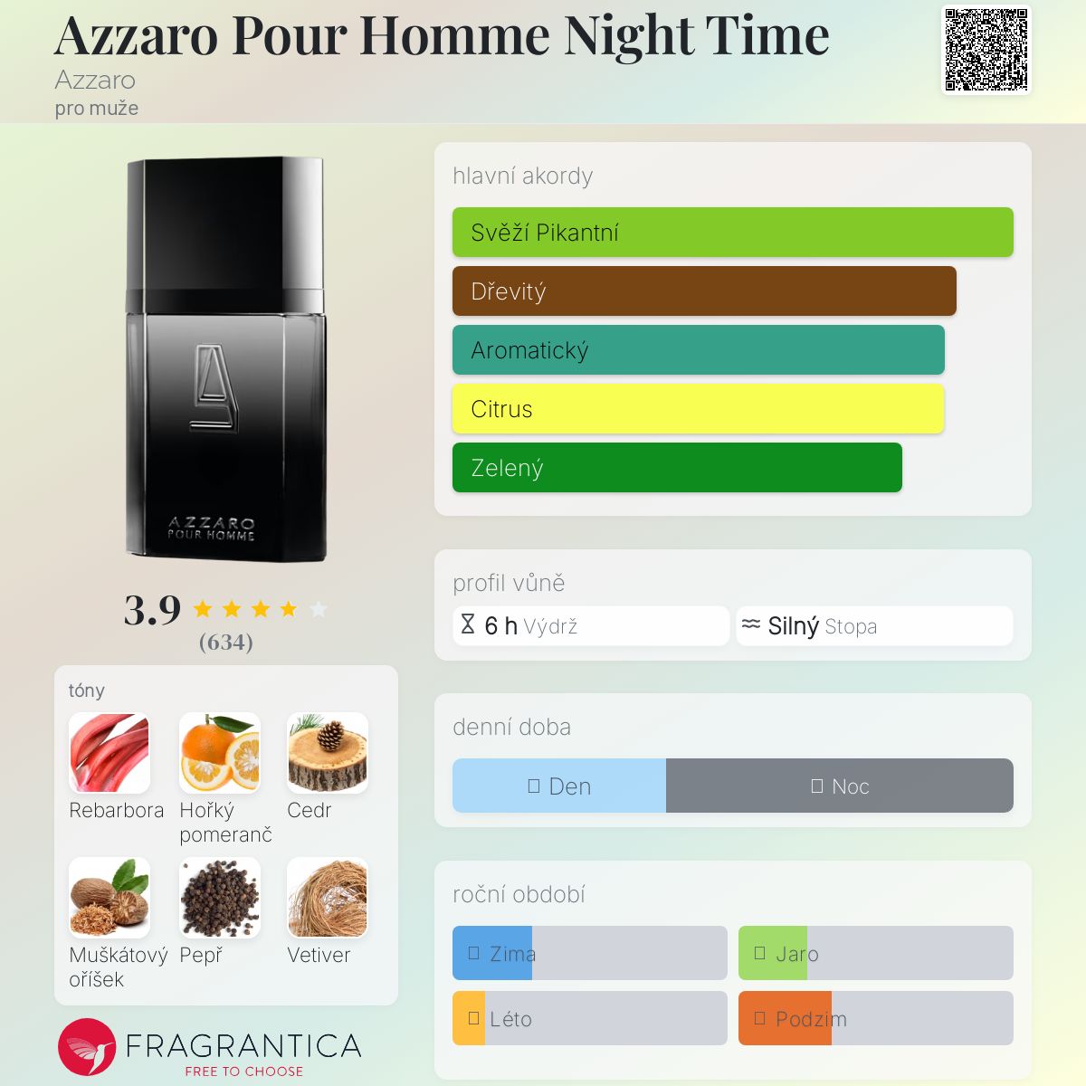 Azzaro Pour Homme Night Time podle Azzaro je Aromatic Fougere vůně pro muže. Azzaro Pour Homme Night Time byl/a uveden/a v roce 2011. Azzaro Pour Homme Night Time byl/a vytvořen/a Christophe Raynaud a Michel Girard. Vrchní tóny jsou Rebarbora a Hořký pomeranč; střední tóny jsouMuškátový oříšek a Pepř ; základní tóny jsou Virginský cedr a Vetiver.