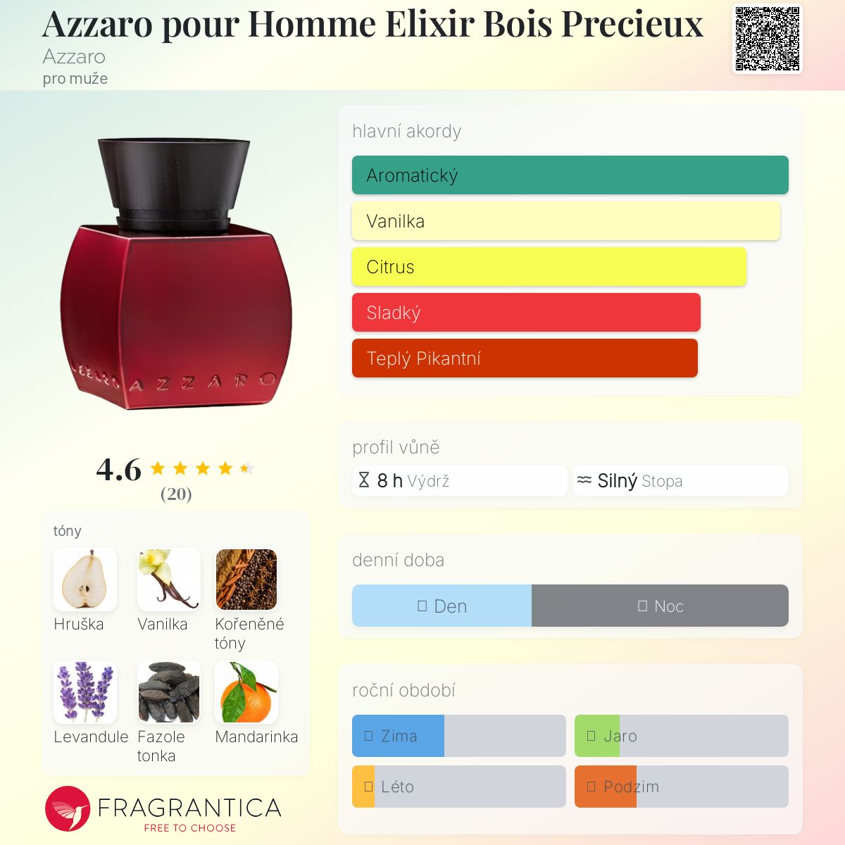 Azzaro pour Homme Elixir Bois Precieux podle Azzaro je Orientální Fougere vůně pro muže. Azzaro pour Homme Elixir Bois Precieux byl/a uveden/a v roce 2010. Vrchní tóny jsou Hruška, Mandarinka, Bergamot, Citron amalfi a Černý rybíz; střední tóny jsouKoření, Levandule a Pelargónie ; základní tóny jsou Vanilka, Fazole tonka, Kumarin, Benzoin, Dubový mech a Francouzské labdanum.