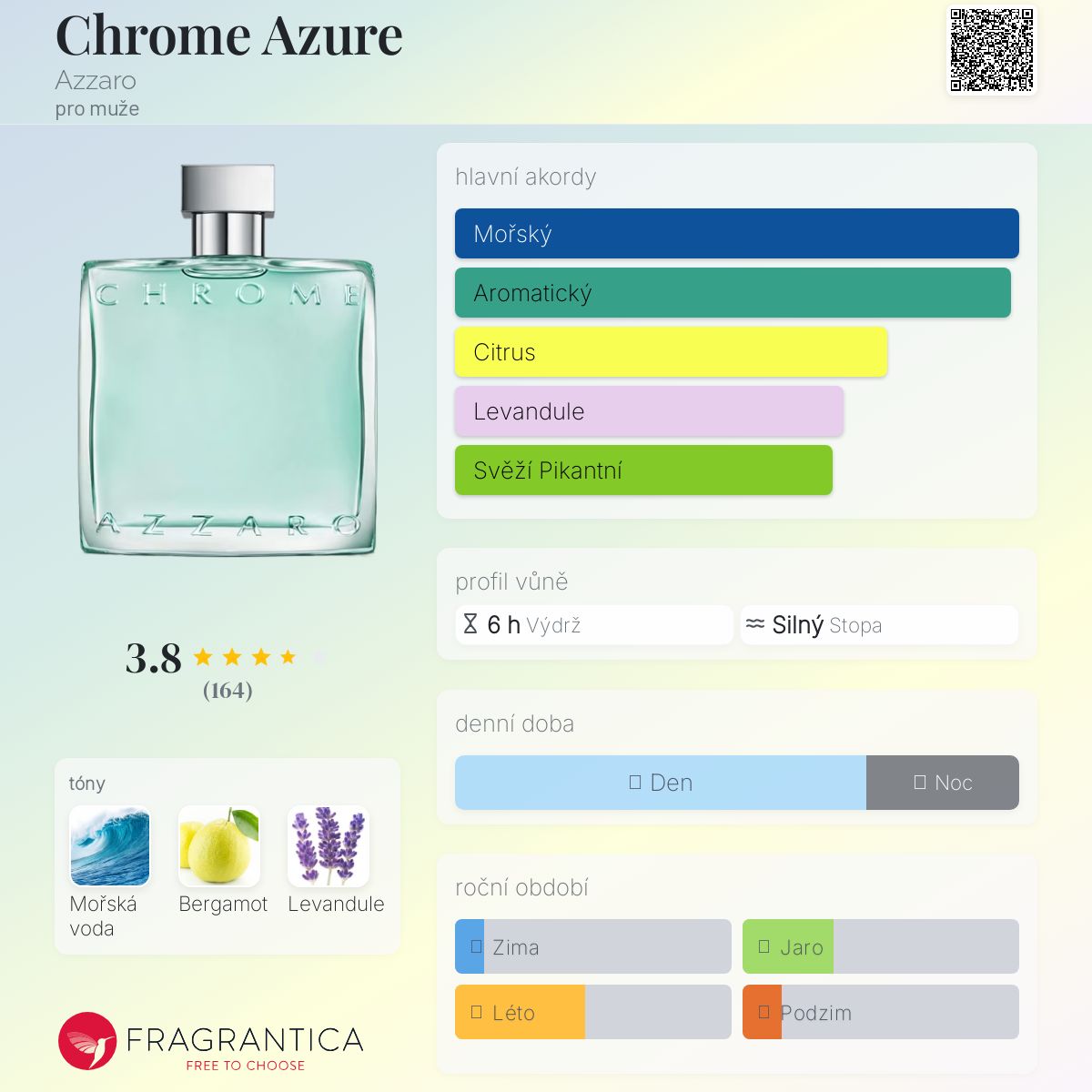 Chrome Azure podle Azzaro je Aromatic Aquatic vůně pro muže. Toto je nová vůně. Chrome Azure byl/a uveden/a v roce 2024. Vrchní tón je Bergamot ; střední tón jeLevandule ; základní tón je Mořské tóny.