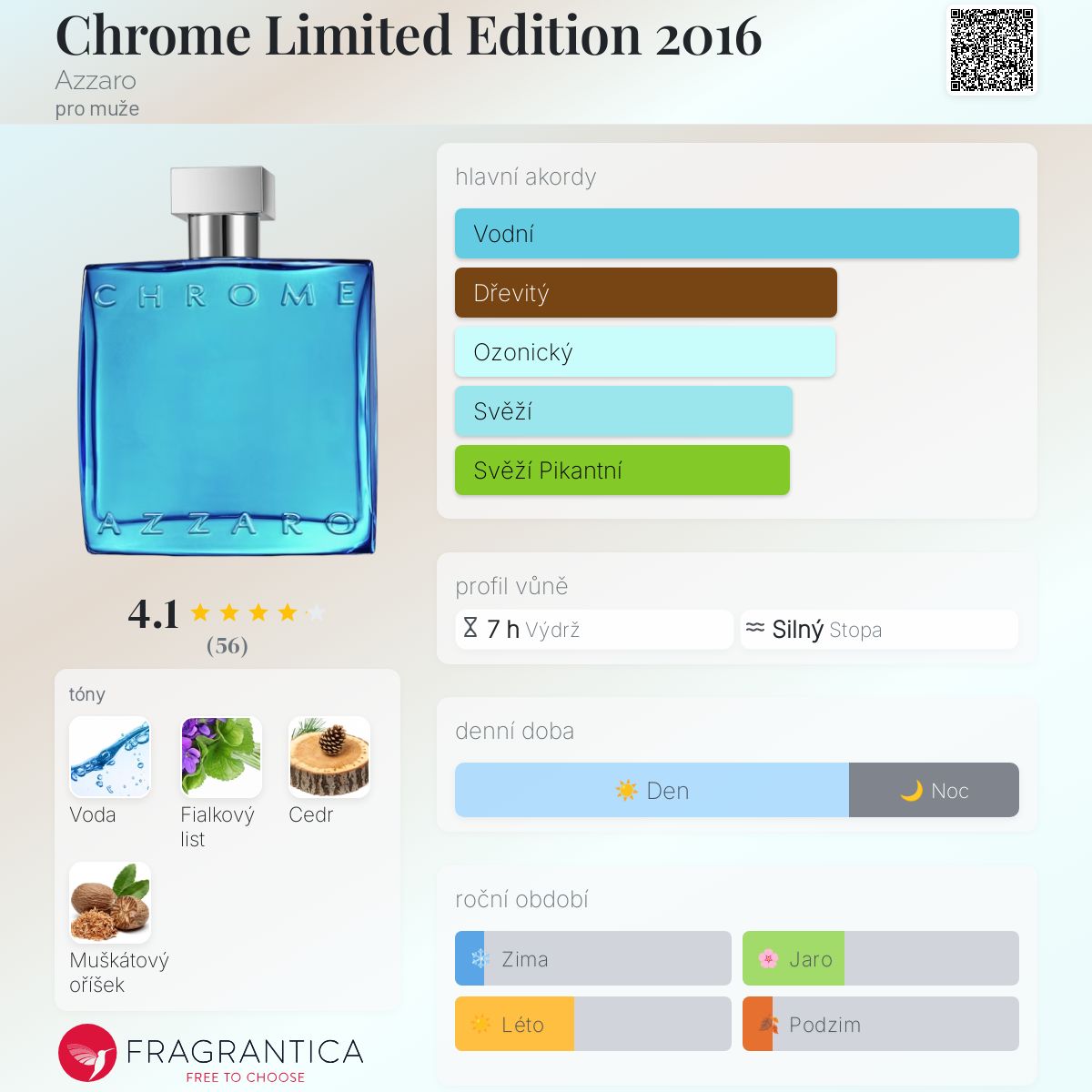 Chrome Limited Edition 2016 podle Azzaro je Woody Spicy vůně pro muže. Chrome Limited Edition 2016 byl/a uveden/a v roce 2016. "Nosem" za touto vůní je Dorothée Piot. Vrchní tón je Fialkový list ; střední tóny jsouVodnaté tóny a Muškátový oříšek ; základní tón je Virginský cedr.