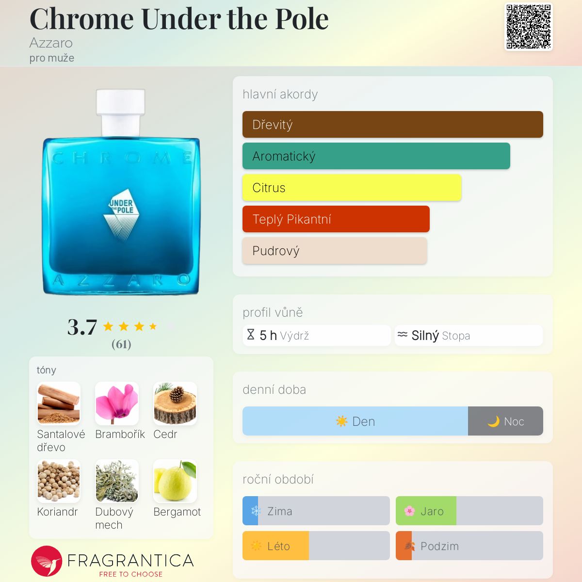 Chrome Under the Pole podle Azzaro je Citrus Aromatic vůně pro muže. Chrome Under the Pole byl/a uveden/a v roce 2018. Vrchní tóny jsou Kalábrijský bergamot, Citrón, Rozmarýn, Ananas a Neroli; střední tóny jsouBrambořík, Koriandr, Dubový mech a Jasmín ; základní tóny jsou Santalové dřevo, Cedr, Dubový mech, Fazole tonka, Brazilské růžové dřevo, Pižmo a Kardamom.