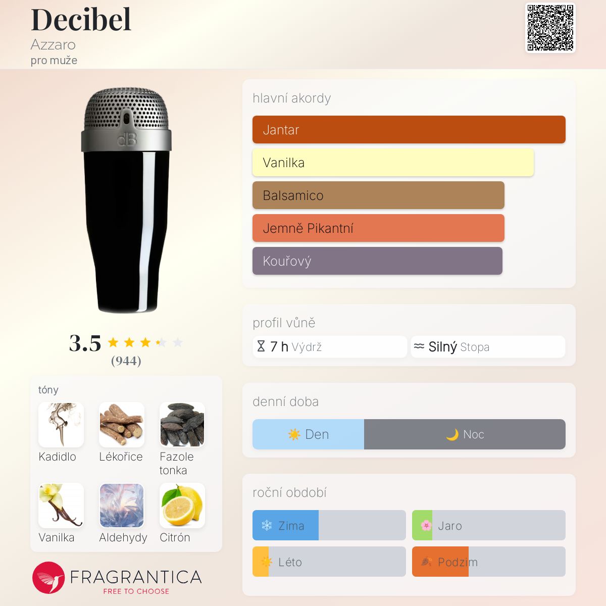 Decibel podle Azzaro je Orientální Spicy vůně pro muže. Decibel byl/a uveden/a v roce 2011. "Nosem" za touto vůní je Christophe Raynaud. Vrchní tóny jsou Lékořice, Aldehydy a Citron amalfi; střední tóny jsouKadidlo a Fialka ; základní tóny jsou Fazole tonka, Vanilka a Vetiver.