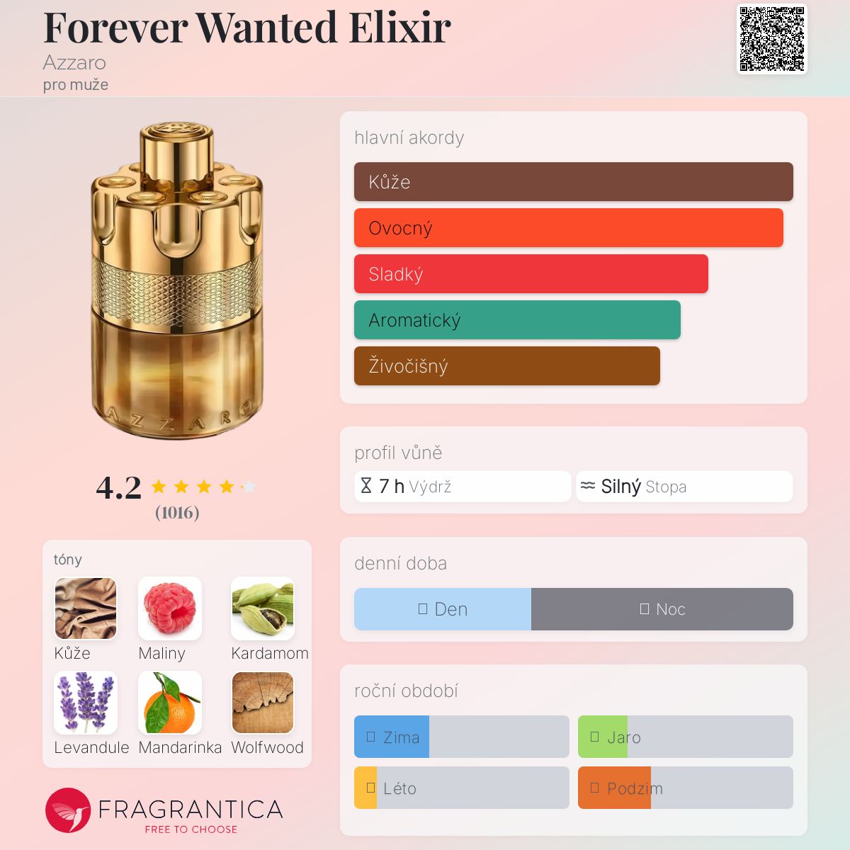 Forever Wanted Elixir podle Azzaro je Leather vůně pro muže. Toto je nová vůně. Forever Wanted Elixir byl/a uveden/a v roce 2025. Vrchní tóny jsou Maliny, Zelená mandarinka a Bergamot; střední tóny jsouKardamom, Levandule a Šalvěj muškátová ; základní tóny jsou Kůže, Wolfwood a Vetiver.