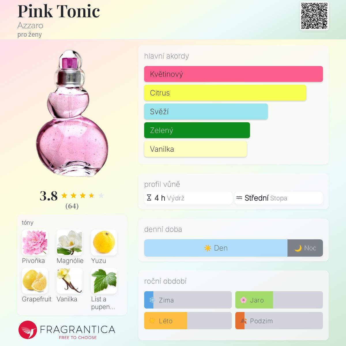 Pink Tonic podle Azzaro je Floral Fruity vůně pro ženy. Pink Tonic byl/a uveden/a v roce 2006. "Nosem" za touto vůní je Ursula Wandel. Vrchní tóny jsou Yuzu, Růžový grapefruit a Kasie; střední tóny jsouRůžová pivoňka a Magnólie ; základní tóny jsou Vanilka, Pižmo a Cedr.