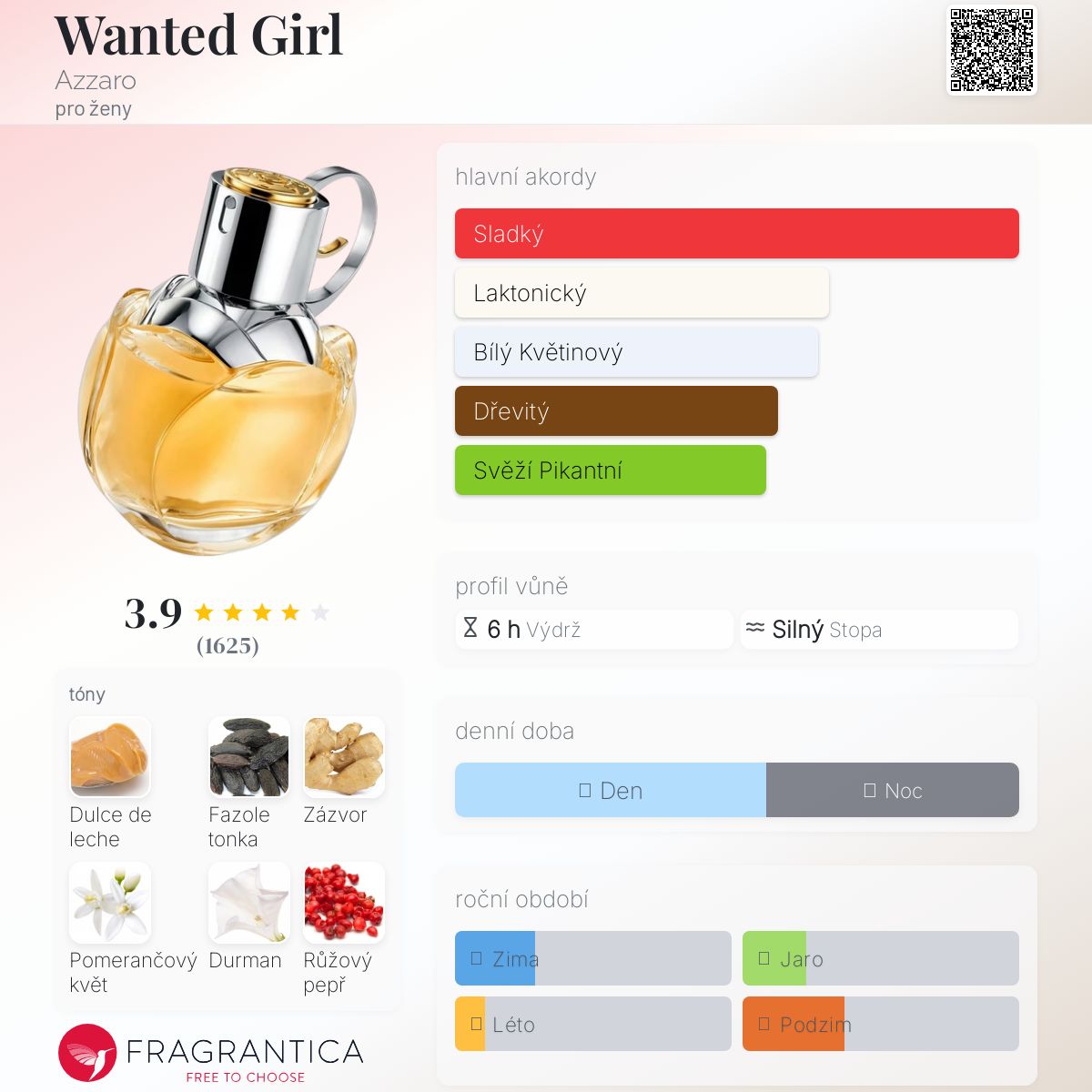 Wanted Girl od Azzaro je vůně, která obsahuje Datura, narkotickou květinu, která způsobuje závislost, s lehkým ovocným nádechem granátového jablka a krémovostí fazole tonka, není vyčerpávající jako jiné parfémy ze stejné čichové rodiny, naopak vás neunaví ji znovu a znovu ochutnávat čichem, je sladká, znamenitá, gurmánské potěšení, které se rozplývá na jazyku.