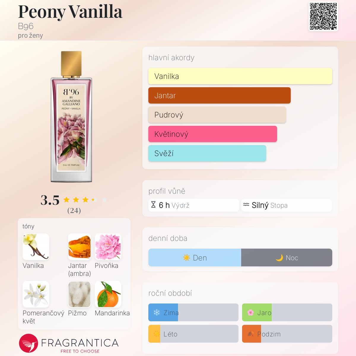 Peony Vanilla podle B96 je Floral vůně pro ženy. Peony Vanilla byl/a uveden/a v roce 2021. "Nosem" za touto vůní je Amandine Galliano. Vrchní tóny jsou Pivoňka, Mandarinka, Černý rybíz a Hruška; střední tóny jsouJantar (ambra), Pomerančový květ, Lískový oříšek a Jasmín ; základní tóny jsou Vanilka, Pižmo, Pačuli a Santalové dřevo.