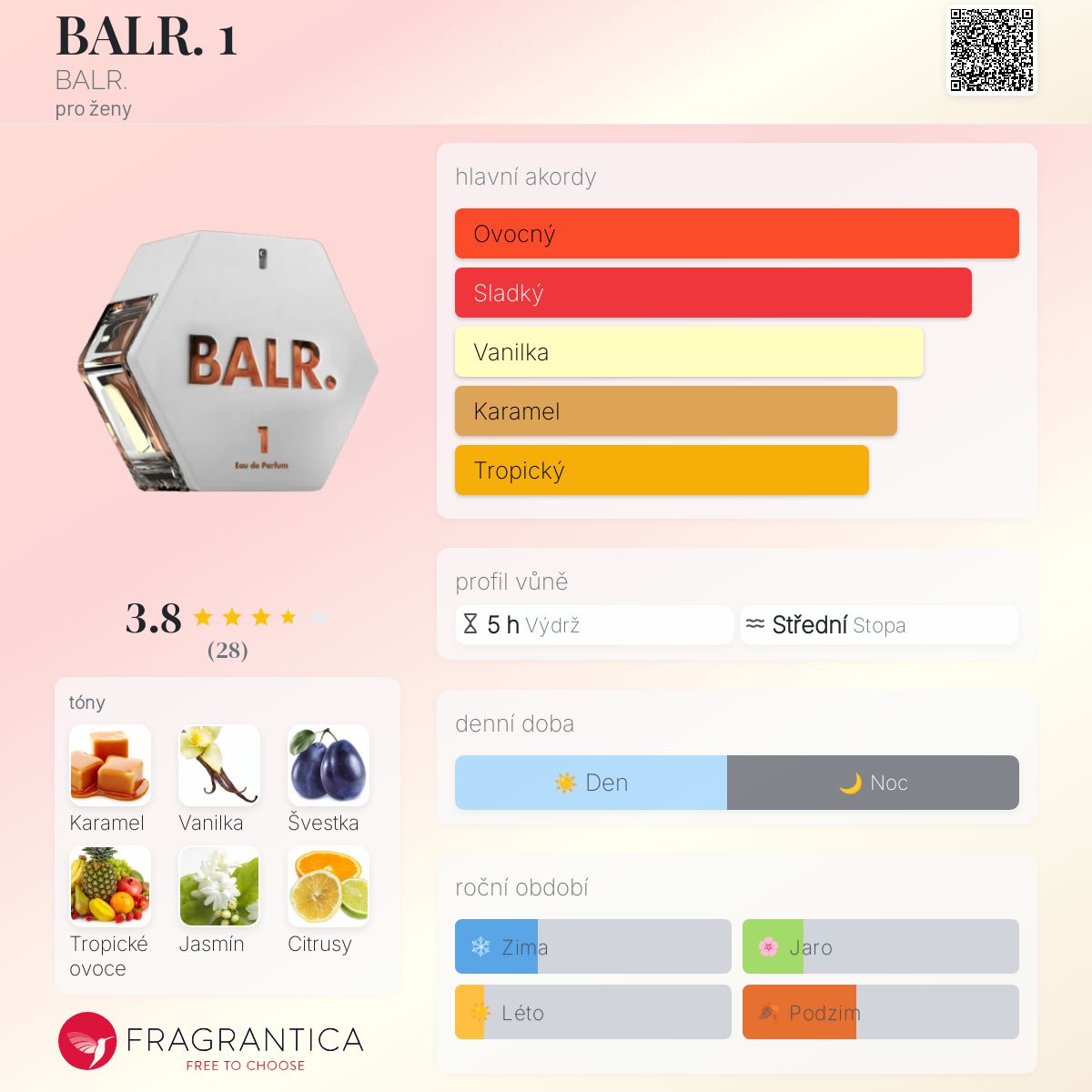 BALR. 1 podle BALR. je vůně pro ženy. BALR. 1 byl/a uveden/a v roce 2019. Vrchní tóny jsou Karamel, Švestka a Tropické ovoce; střední tóny jsouJasmín, Citrusy, Růže a Lotus ; základní tóny jsou Santalové dřevo, Pižmo a Fazole tonka.
