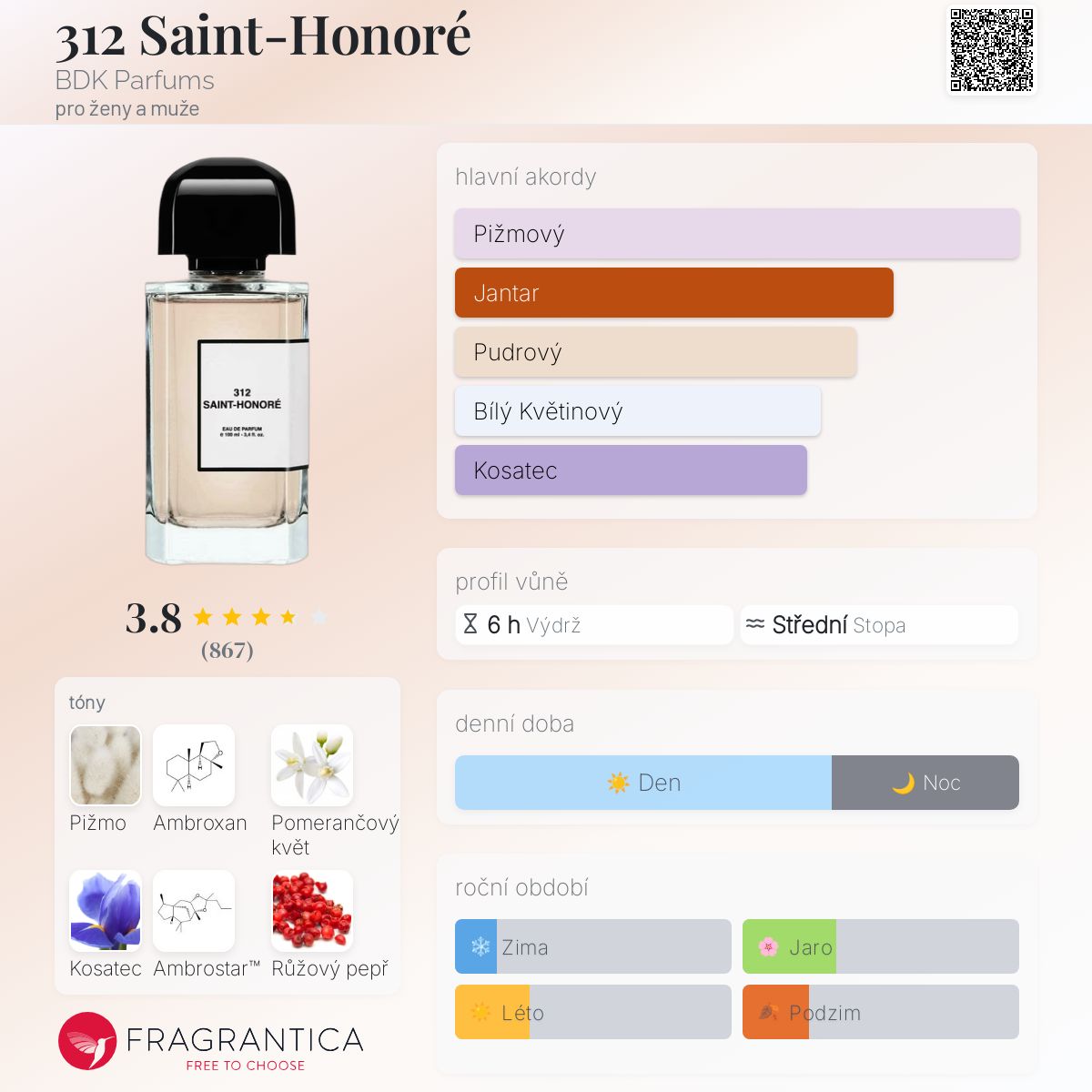 312 Saint-Honoré podle BDK Parfums je Orientální Floral vůně pro ženy a muže. Toto je nová vůně. 312 Saint-Honoré byl/a uveden/a v roce 2024. "Nosem" za touto vůní je Alexandra Carlin. Vrchní tóny jsou Růžový pepř a Kořen anděliky; střední tóny jsouPomerančový květ, Kosatec a Fazole tonka ; základní tóny jsou Bílé pižmo, Ambroxan, Ambrostar™ a Thajský oud.