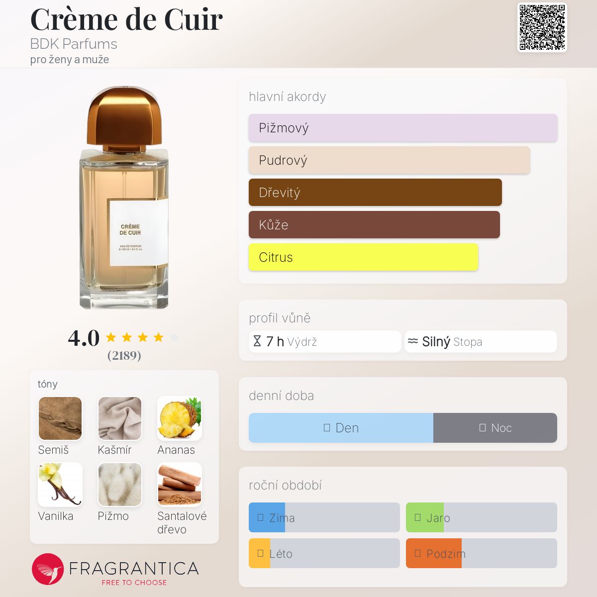 Crème de Cuir podle BDK Parfums je Leather vůně pro ženy a muže. Crème de Cuir byl/a uveden/a v roce 2018. "Nosem" za touto vůní je Violaine Collas. Vrchní tóny jsou Ananas, Grapefruit, Bergamot a Mandarinka; střední tóny jsouBílý semiš, Santalové dřevo, Růžový pepř a Pepř ; základní tóny jsou Kašmír, Vanilka, Bílé pižmo, Šedé pižmo a Bříza.