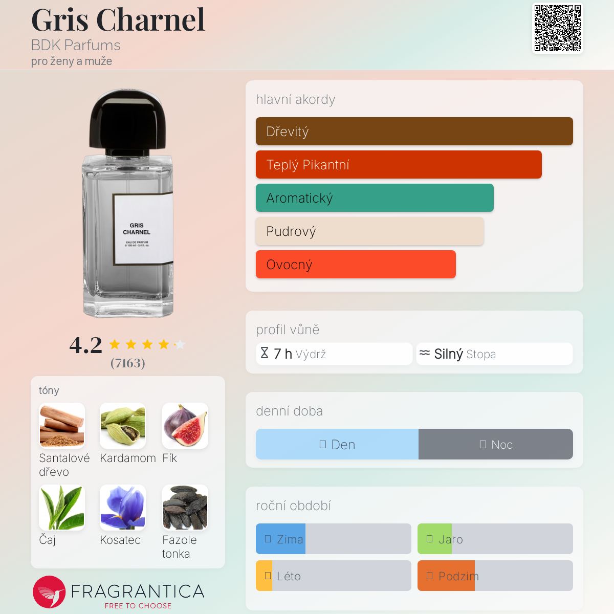 Gris Charnel podle BDK Parfums je Orientální Spicy vůně pro ženy a muže. Gris Charnel byl/a uveden/a v roce 2019. "Nosem" za touto vůní je Mathilde Bijaoui. Vrchní tóny jsou Kardamom, Fík a Černý čaj; střední tóny jsouKosatec a Bourbonský vetiver ; základní tóny jsou Santalové dřevo a Fazole tonka.