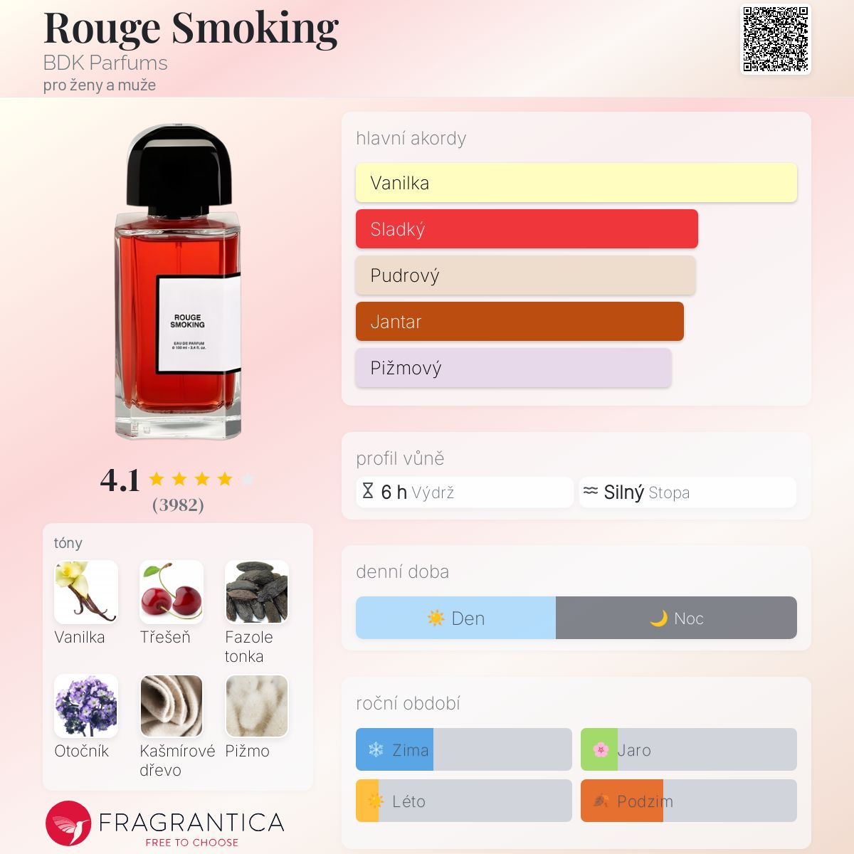 Rouge Smoking je sladká. Spousta třešní 🍒 a heliotropu a vanilky... s trochou pižma a náznakem fazole tonky, která dodává trochu toho typického "kouřového" tónu tonky.