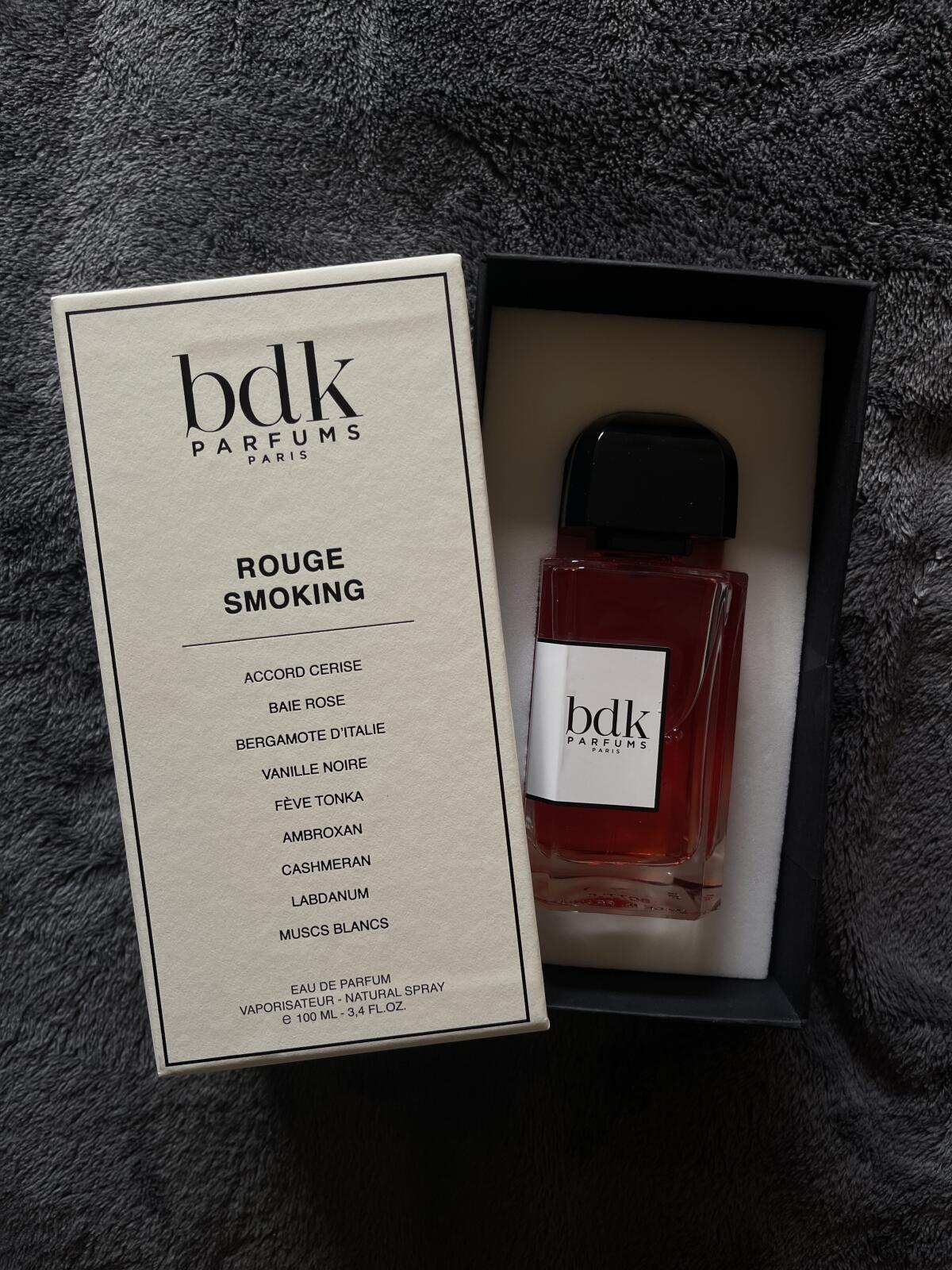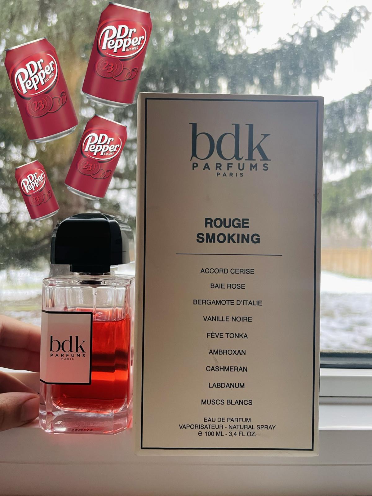 Rouge Smoking podle BDK Parfums je Orientální vůně pro ženy a muže. Rouge Smoking byl/a uveden/a v roce 2018. "Nosem" za touto vůní je Amelie Bourgeois. Vrchní tóny jsou Třešeň, Růžový pepř a Bergamot; střední tóny jsouČerný vanilkový lusk, Otočník a Pomerančový květ ; základní tóny jsou Fazole tonka, Kašmírové dřevo, Bílé pižmo, Ambroxan, Fialka a Labdanum.