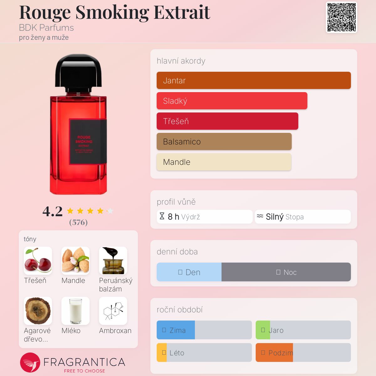 Rouge Smoking Extrait podle BDK Parfums je Orientální vůně pro ženy a muže. Toto je nová vůně. Rouge Smoking Extrait byl/a uveden/a v roce 2024. Rouge Smoking Extrait byl/a vytvořen/a Amélie Bourgeois a Margaux Le Paih Guérin. Vrchní tóny jsou Třešeň, Mandle, Růžový pepř, Red Mandarin a Bergamot; střední tóny jsouPeruánský balzám, Mléko, Fazole tonka a Španělské labdanum ; základní tóny jsou Agarové dřevo (oud), Rum, Ambroxan, Vanilka, Jantar (ambra), Pačuli, Benzoin a Siam.