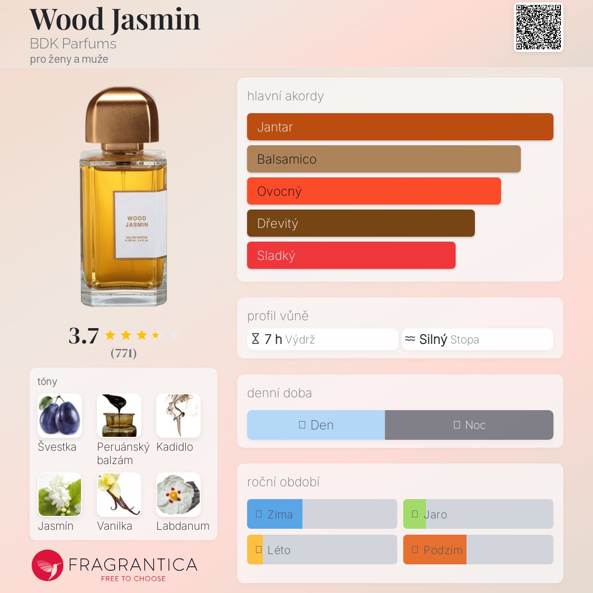 Wood Jasmin podle BDK Parfums je Orientální Floral vůně pro ženy a muže. Wood Jasmin byl/a uveden/a v roce 2016. "Nosem" za touto vůní je Camille Leguay. Vrchní tóny jsou Švestka a Hruška; střední tóny jsouJasmín Sambac, Egyptský jasmín, Pelyněk a Turecká růže ; základní tóny jsou Peruánský balzám, Kadidlo, Madagaskarská vanilka, Španělské labdanum, List indonéského pačuli a Cypriolový olej.