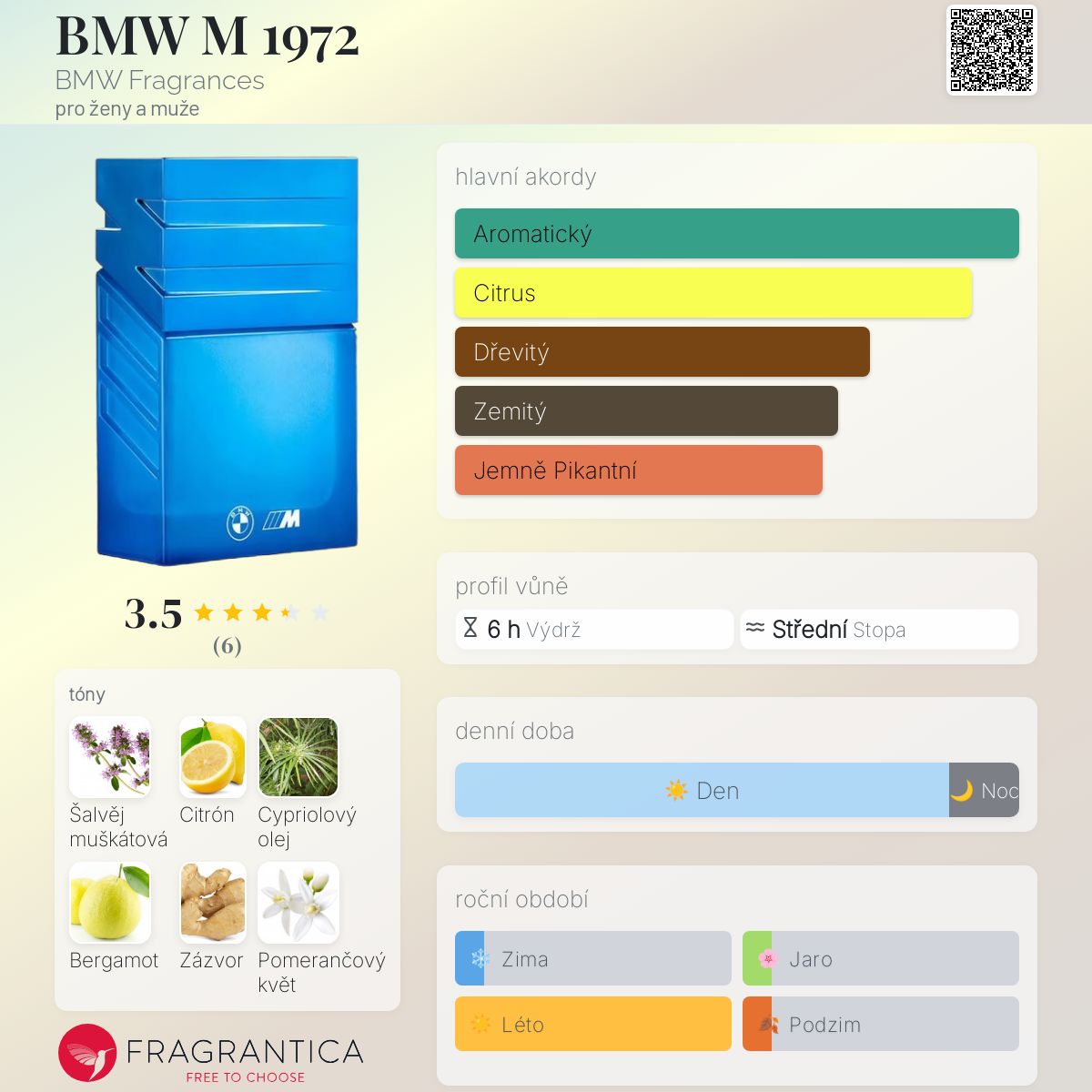 BMW M 1972 podle BMW Fragrances je Citrus Aromatic vůně pro ženy a muže. Toto je nová vůně. BMW M 1972 byl/a uveden/a v roce 2025. BMW M 1972 byl/a vytvořen/a Frank Voelkl a Alexandra Monet. Vrchní tóny jsou Citrón, Kalábrijský bergamot a Zázvor; střední tóny jsouŠalvěj muškátová, Pomerančový květ a Helvetolide ; základní tóny jsou Cypriolový olej, Haitský vetiver a Anthamber™.